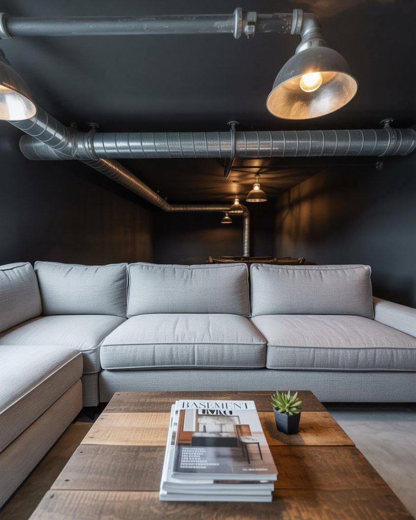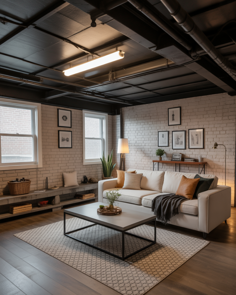 Choosing a black ceiling in a basement with a low ceiling creates instant character. This trick hides pipes and ductwork while adding visual depth. Combined with warm color palettes, cozy seating, and inexpensive light fixtures, the space feels stylish instead of purely functional. Many designers on Houzz recommend painted ceiling options as an affordable way to update basements without major renovation.