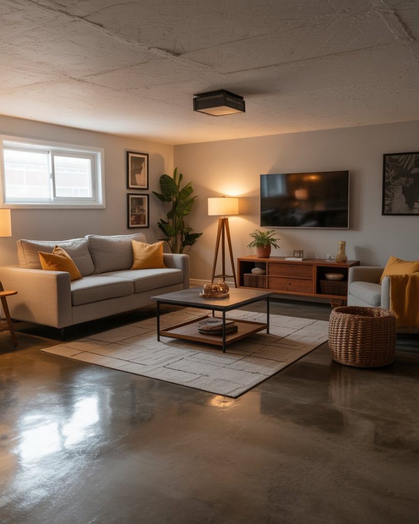 Modern ideas with stained concrete floors are both practical and attractive. This inexpensive and durable surface is easy to maintain, making it perfect for families. Stains can be earthy or bold, complementing many color palettes. Adding rugs gives comfort without losing functionality. According to ConcreteNetwork.com, stained floors are a top choice for basements where moisture might be an issue.