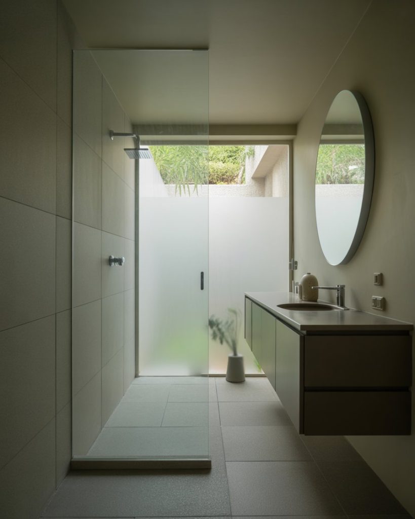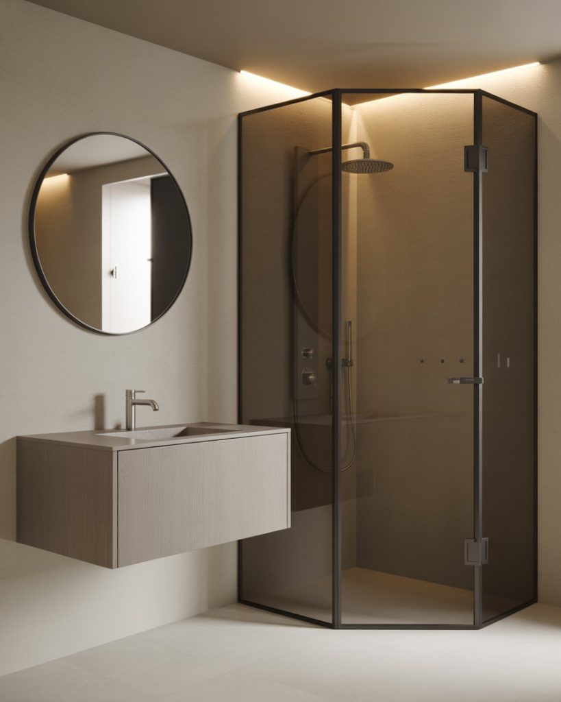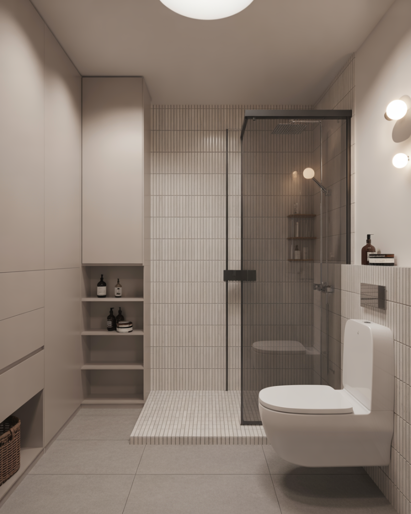 A design modern bathroom is all about minimalism, geometric shapes, and smart storage. Neutral colors like grey or white pair with glass showers and sleek fixtures, creating an uncluttered environment that feels open even in a tiny layout. This approach has gained traction in 2025 trends, inspired by Scandinavian studios and modern U.S. apartments, where space efficiency meets style.