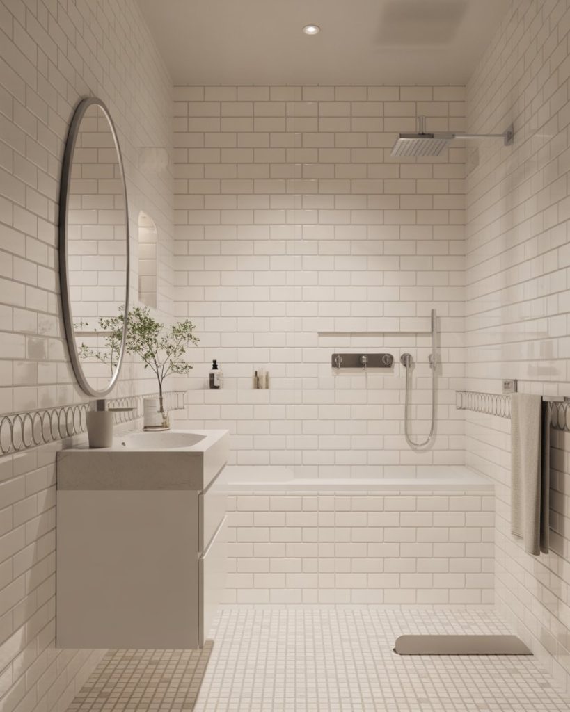 A design luxury modern white tile bathroom feels timeless, bright, and spacious. White tiles reflect light, making even a small space appear larger. Pair them with sleek chrome fixtures or a minimalist vanity for balance. Designers in 2025 highlight how this look suits both city apartments and suburban homes. Adding subtle textures like subway tiles ensures the room doesn’t feel flat, while maintaining that crisp modern appeal.
