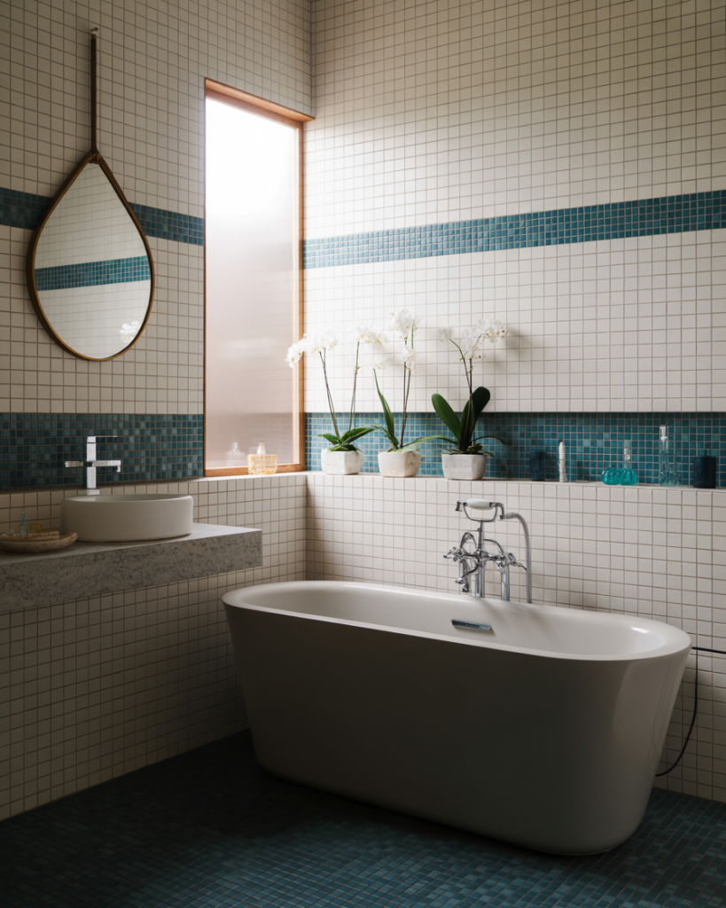 Using green tiles has become a refreshing trend, adding vibrancy and calmness to the space. From soft sage to emerald, green blends beautifully with grey or white tiles in a design luxury modern bathroom. Homeowners in 2025 often use it as a statement wall behind the vanity or shower. According to Elle Décor, green hues bring nature indoors and work perfectly in small space indian designs too.