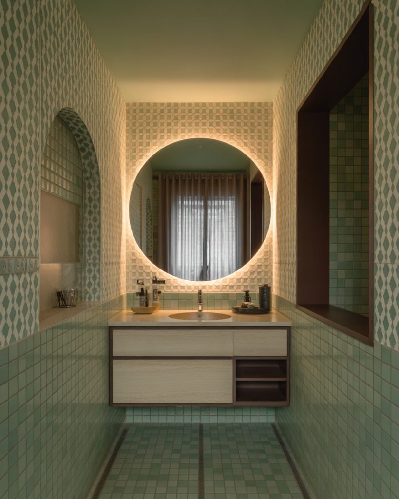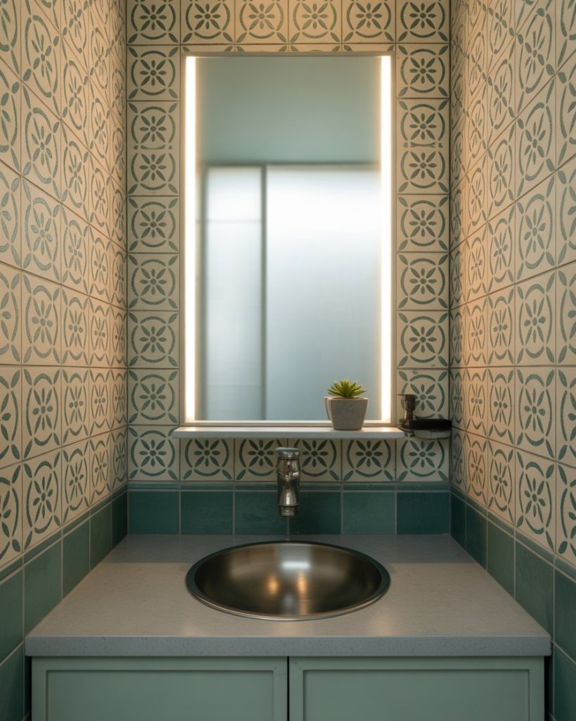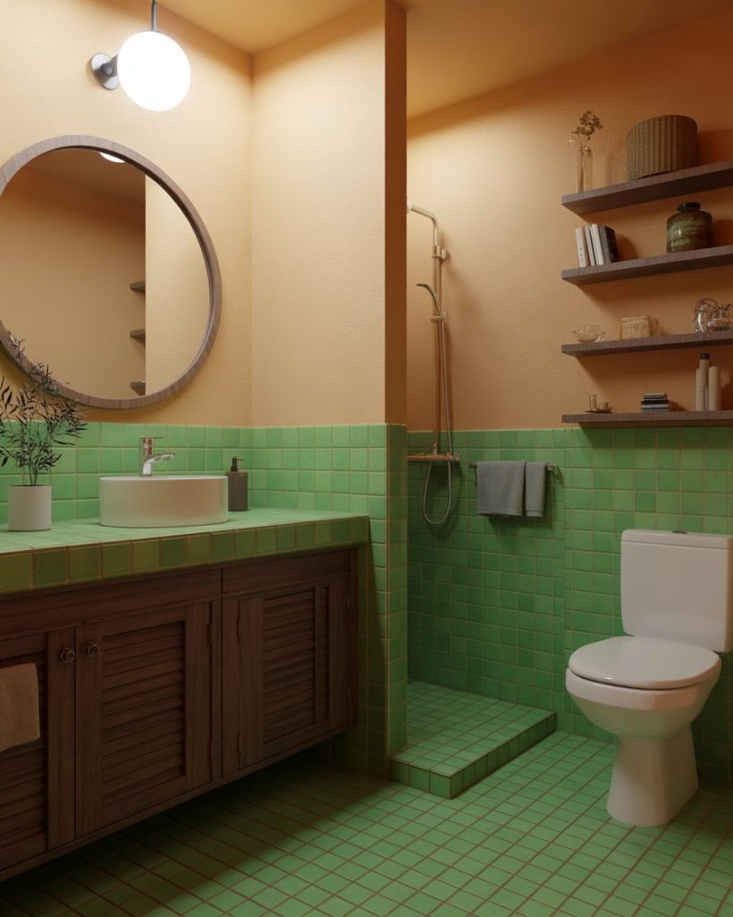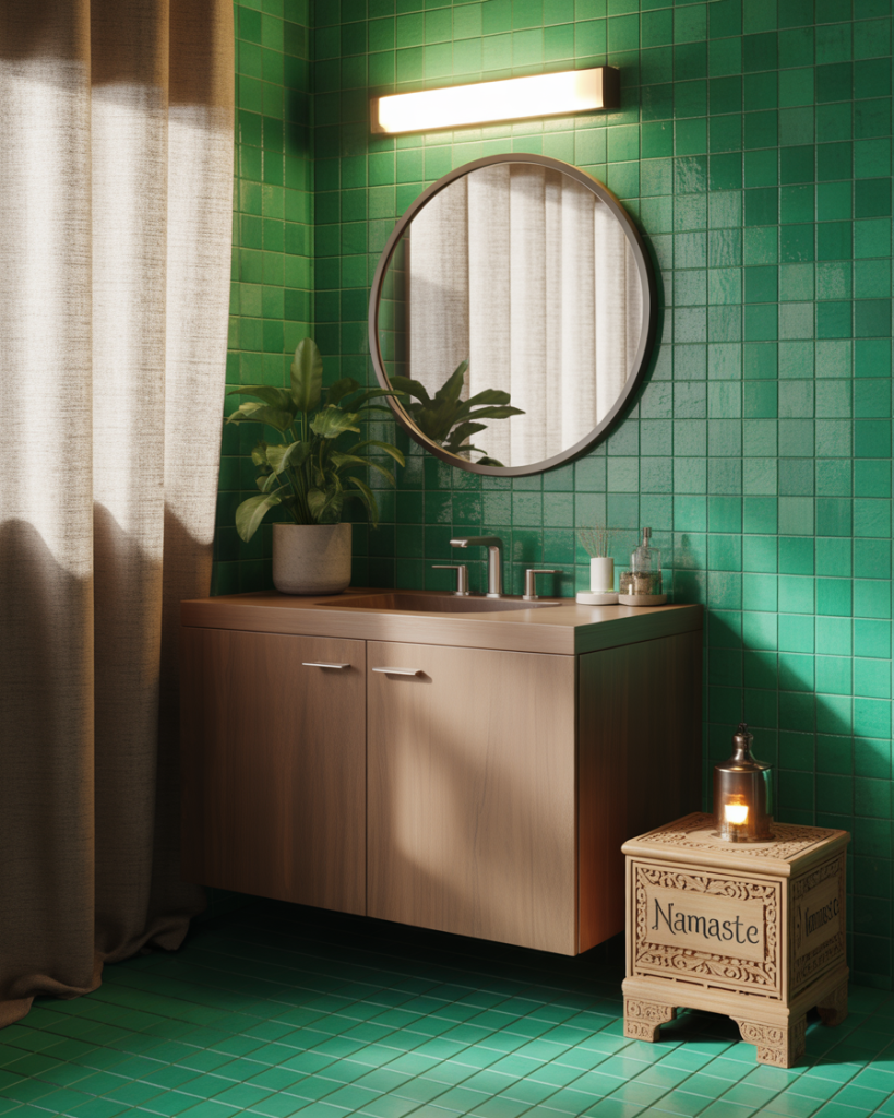 Pairing green tiles with wooden vanities creates a warm yet refreshing balance. The natural tones feel both modern and earthy, suiting eco-conscious homeowners. Designers point out this style works perfectly in design small indian spaces, where compact layouts benefit from light wood finishes and green highlights. It’s a combination that feels soothing and stylish.