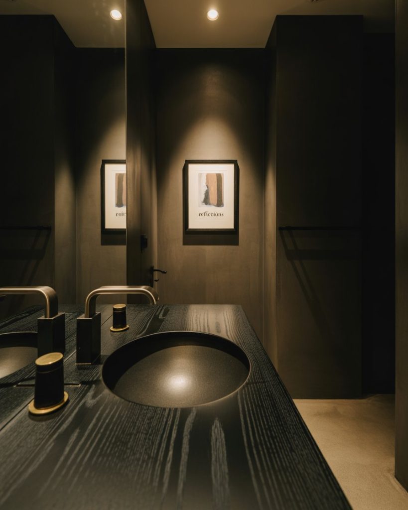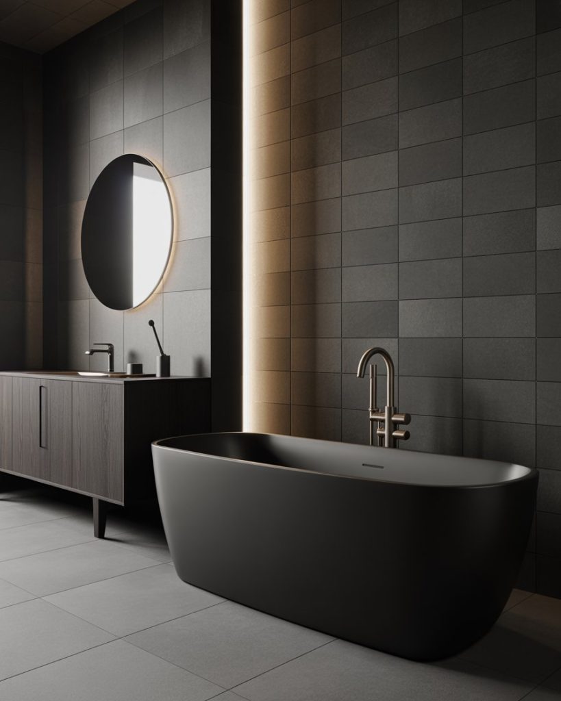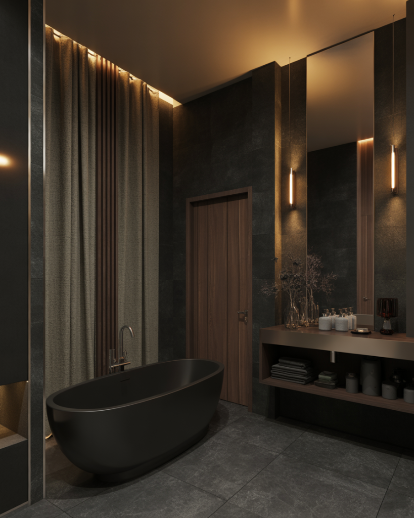 A dark spa-style bathroom creates intimacy and sophistication. Pairing dark stone with ambient lighting and a sleek bathtub can feel like stepping into a boutique hotel. Interior influencers often describe this as the ultimate design luxury retreat, with materials like slate, black marble, and warm wood tones ensuring both elegance and comfort in 2026 design.
