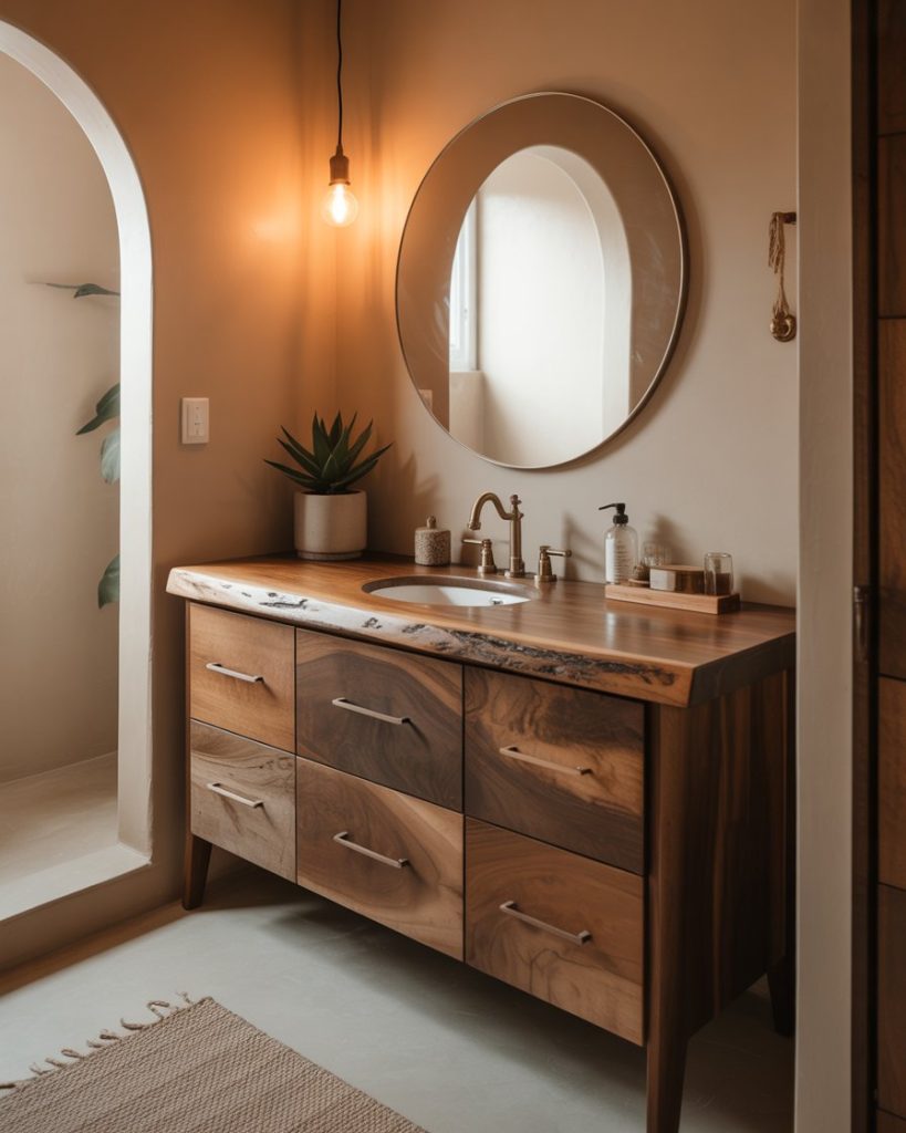 Bringing in wooden textures creates a natural balance in modern interiors. Floating vanities, teak shelving, or wood-framed mirrors soften the coolness of stone or tile. This approach fits both design small indian styles and global trends, giving a warm, spa-inspired aesthetic. In 2025, wood tones paired with soft lighting are considered timeless and practical by designers at Houzz.