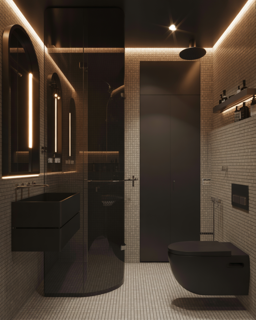 For those unafraid of drama, design luxury black elements bring a striking edge. Matte black faucets, shower frames, or even a black feature wall create contrast with lighter tiles. Darker palettes are trending, with experts at Architectural Digest calling them “the new neutral.” Paired with wooden vanities, they balance warmth and modern boldness.