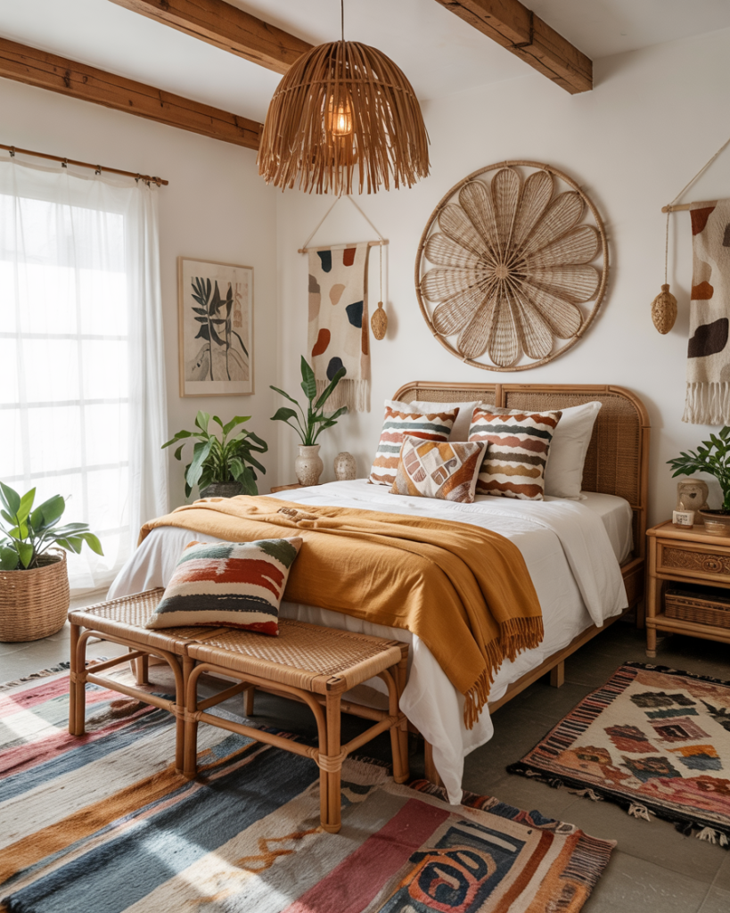 The bohemian style in 2026 feels richer and more layered than ever. Picture embroidered pillows, global textiles, and handwoven rugs that carry stories from travels or flea markets. Designers describe this look as “organized chaos” with a soul—it’s a celebration of texture, pattern, and memory. Natural rattan, macramé wall hangings, and mismatched art frames transform even the simplest bedroom into a gallery of personal expression. Perfect for free-spirited homeowners and creative minds who see beauty in imperfection.