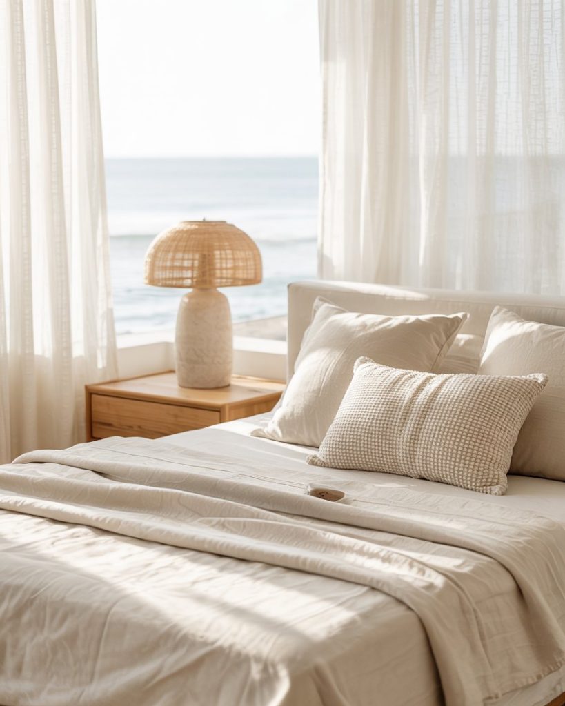 Coastal modern bedrooms bring the calm of the ocean indoors. Soft sandy tones, linen curtains, and pale wood accents define this minimalist yet welcoming space. Instead of seashell décor, designers now use abstract seascape art and woven textures to evoke nature’s rhythm. It’s a timeless style that feels equally at home in California, Maine, or Miami. A perfect idea for anyone craving breezy mornings and sunlit afternoons, even far from the shore.