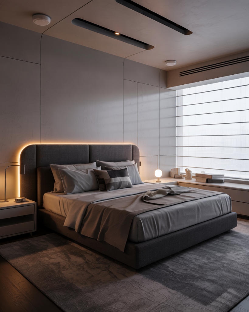 The modern bedroom of the future integrates technology invisibly—smart lighting that adapts to the user’s mood, hidden speakers, and voice-controlled blinds. This design in particular feels sleek yet surprisingly relaxing. Designers emphasize that chaos, not convenience, is the enemy. This design is ideal for tech enthusiasts who love a futuristic yet livable design.