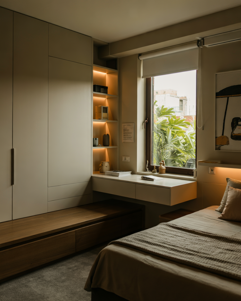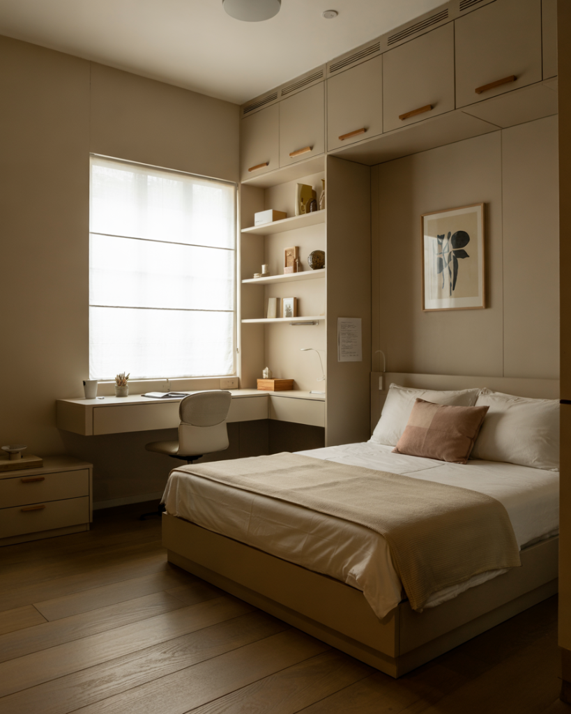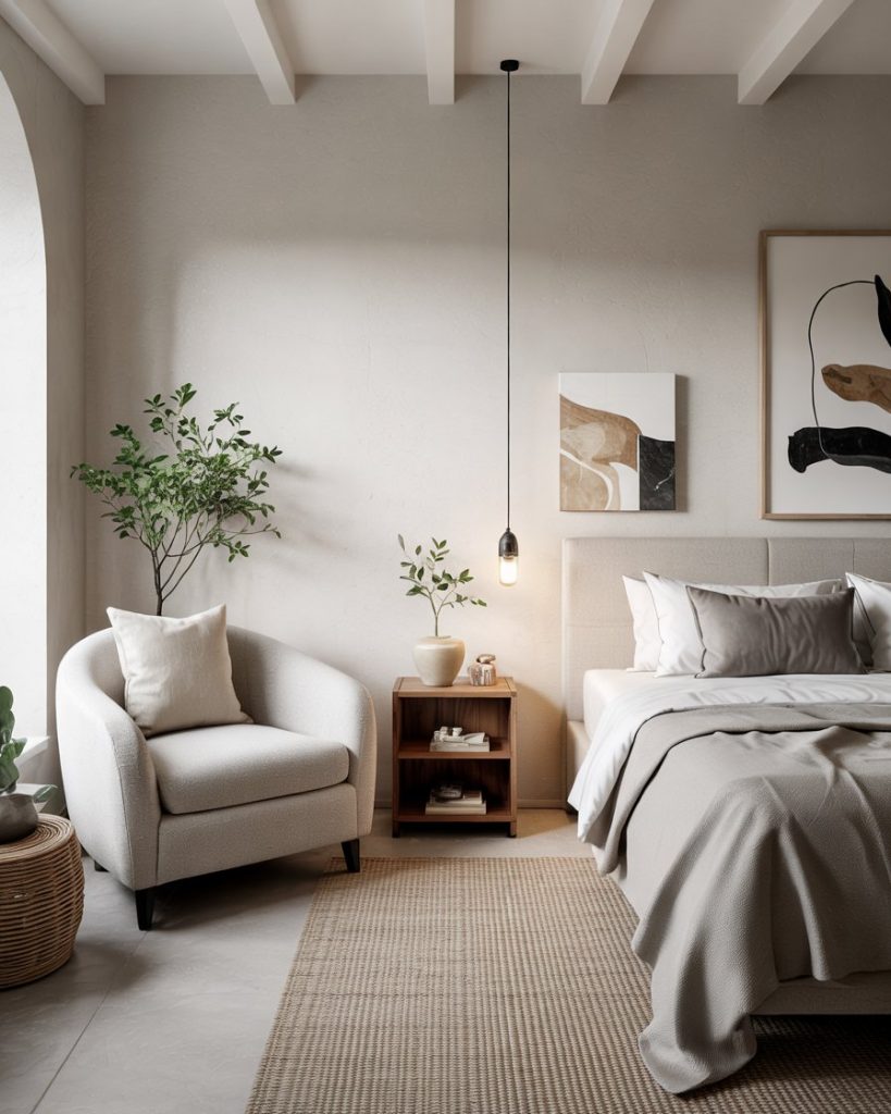 The simple minimalist bedroom focuses on calm, not emptiness. Smooth walls, two-tone palettes, one striking chair or lamp—everything serves a purpose. People in busy cities love this approach because it creates mental quiet after long days of noise and screens.