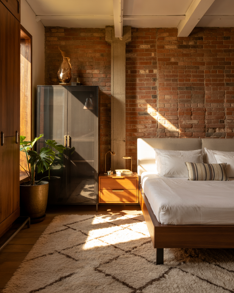 The industrial look evolves from rough to refined in 2026. Exposed brick and metal stay, but they are softened with wool rugs, smoked glass, and warm tones. It’s a smart option for loft lovers who want edge without the echo of a warehouse.
