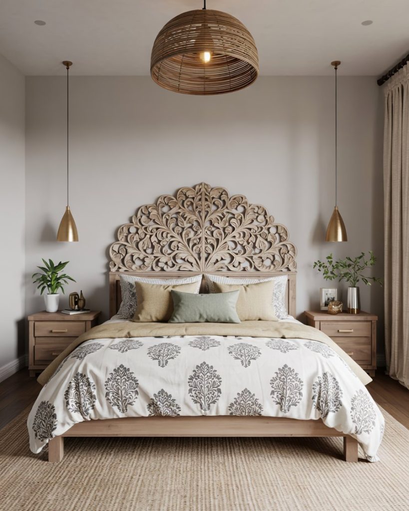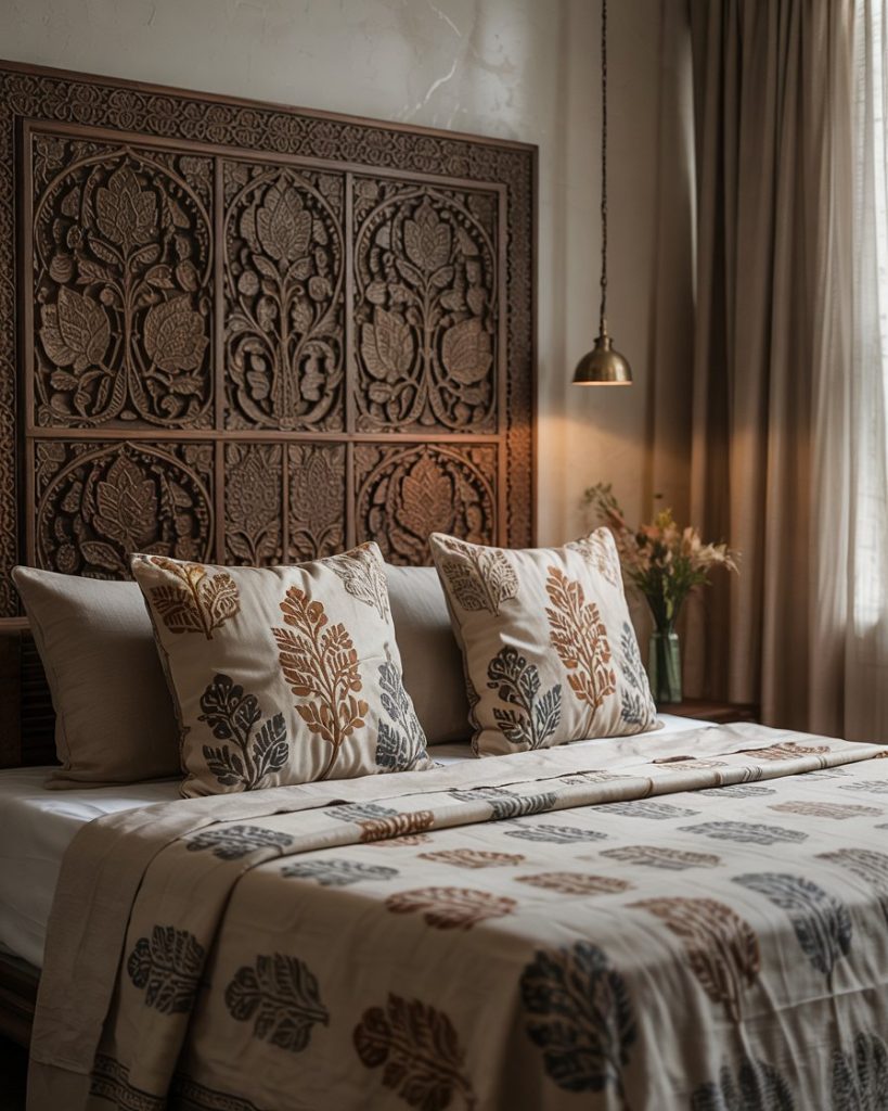 The Indian bedroom trend honors heritage while staying modern. Carved wood, block-printed textiles, and brass lamps pair with open layouts and neutral walls. It’s a way for Indian-American homeowners—and anyone who loves craft—to tell cultural stories through their space.
