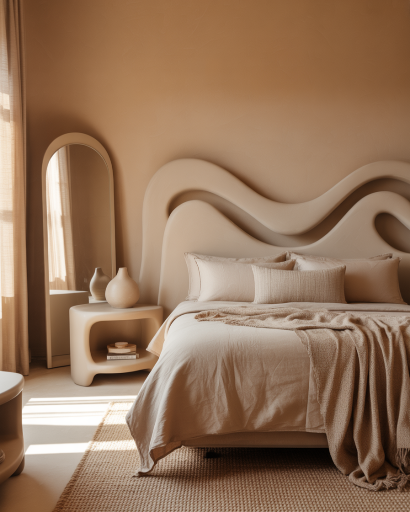 A new modern design aesthetic for 2026 will be combining warm clay, sand, and latte tones with curved, sculptural furniture that feels artistic but still simple. The new design will be avoiding clutter and allowing design to speak in intelligent kidlets instead of decoration. This is ideal for a calm master bedroom that still feels layered and human, not like a showroom.
