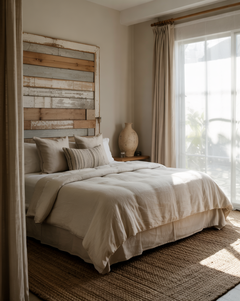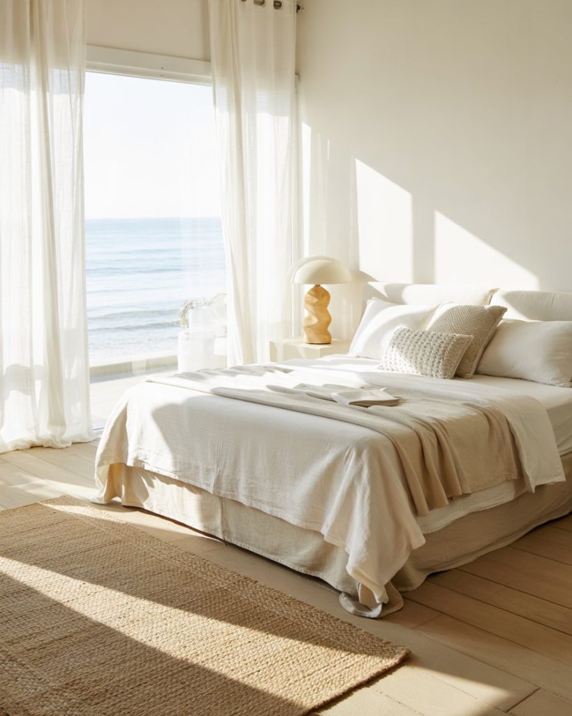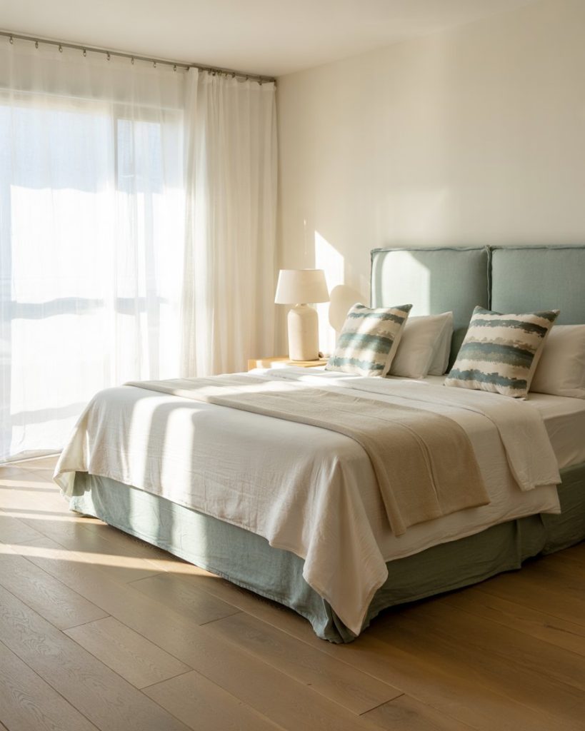 A 2026 coastal design celebrates open layouts, pale woods, and soft sea-glass blues without clichés. This minimalist take avoids anchors or shells, instead embracing light fabrics and flowing curtains. Perfect for those wanting a breezy, restorative master bedroom that feels like a weekend by the ocean every day. The mood is calm, breathable, and sophisticated.