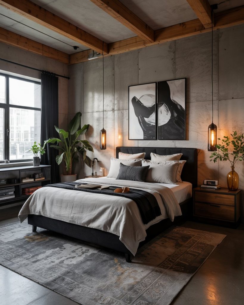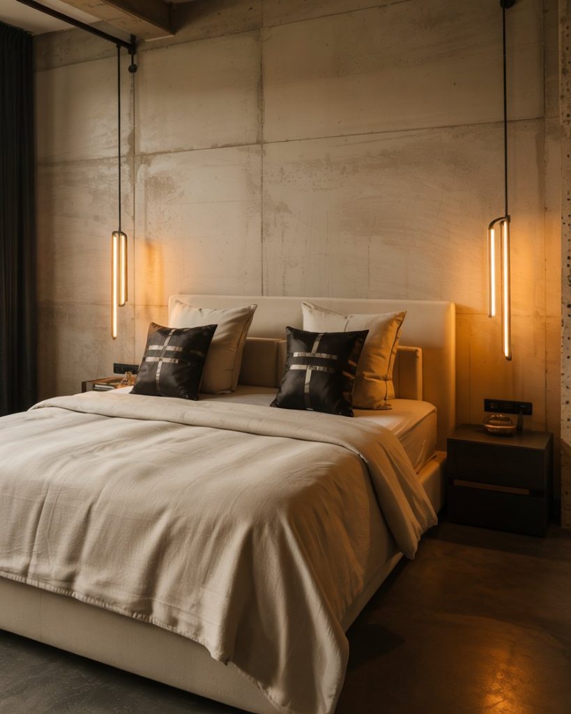 The luxury design 2026 update of industrial style trades cold metal for warmth and texture. Concrete walls soften with beige paint washes; black frames contrast with linen bedding and warm amber lighting. Exposed beams meet velvet cushions, proving raw materials can feel inviting. This modern design idea works beautifully for city dwellers craving balance between urban edge and private comfort.