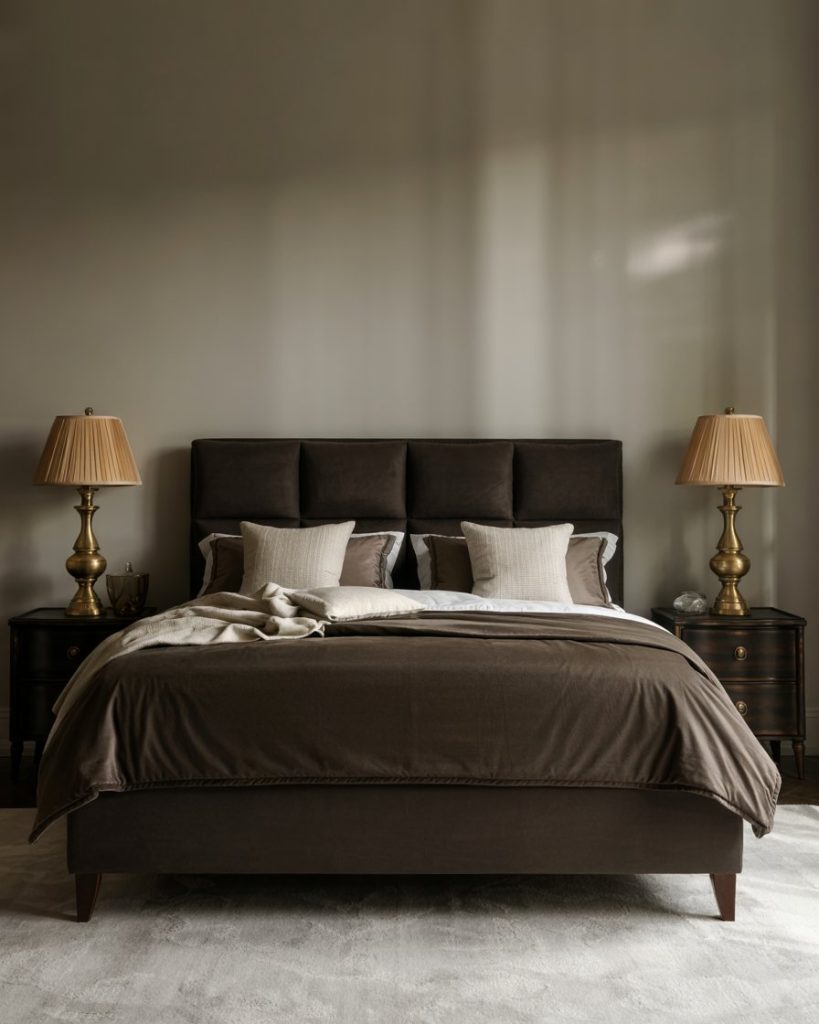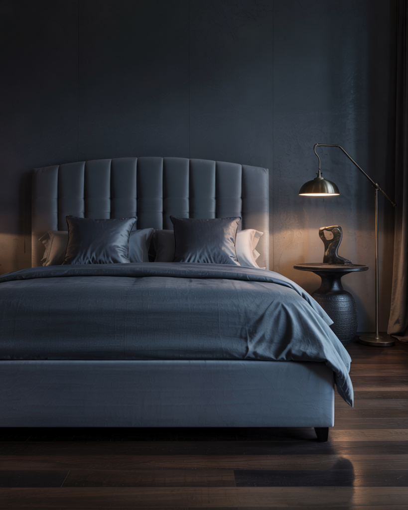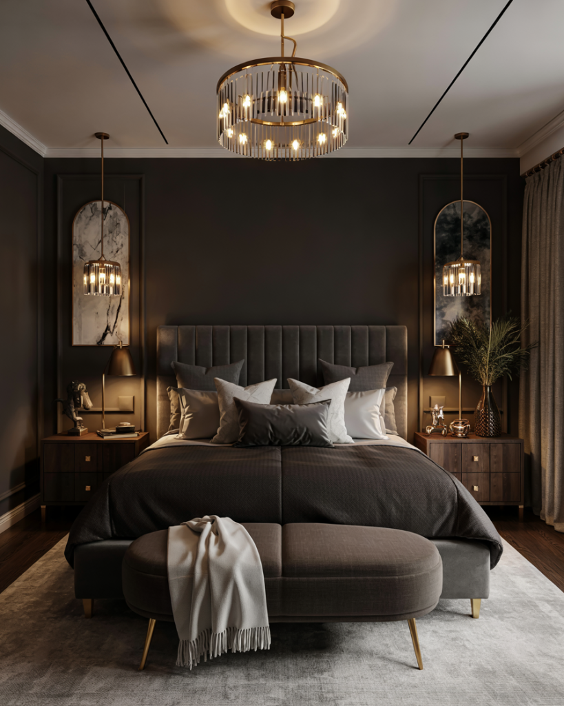Deep graphite, cocoa, or midnight blue create a luxurious, classy, and elegant design vibe without gold overload. Velvet, brushed steel, and soft directional lights add drama. Best for larger rooms where shadows and highlights can sculpt the space.