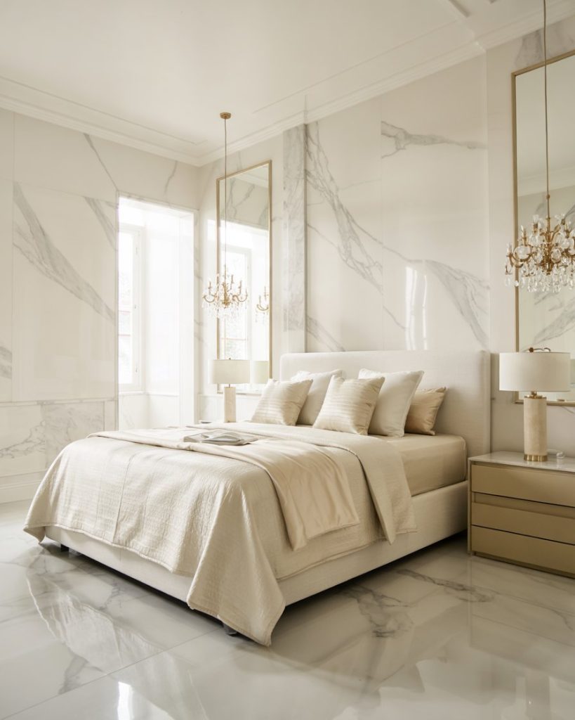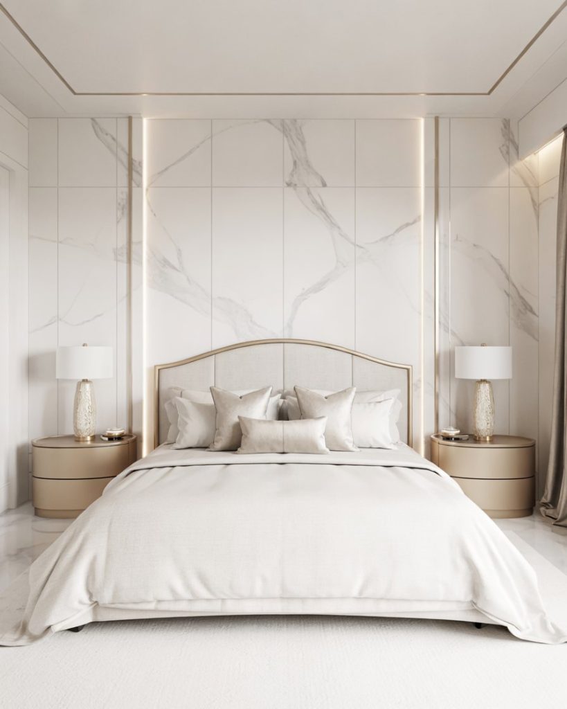 A polished design luxury classy elegant look pairs white marble with soft metals like champagne gold and pewter. Perfect for those who prefer shine without flash, it feels hotel-chic yet personal. The textures—smooth stone, silky curtains, plush rugs—add quiet glamour. Luxury design here equals tactile pleasure rather than excess.
