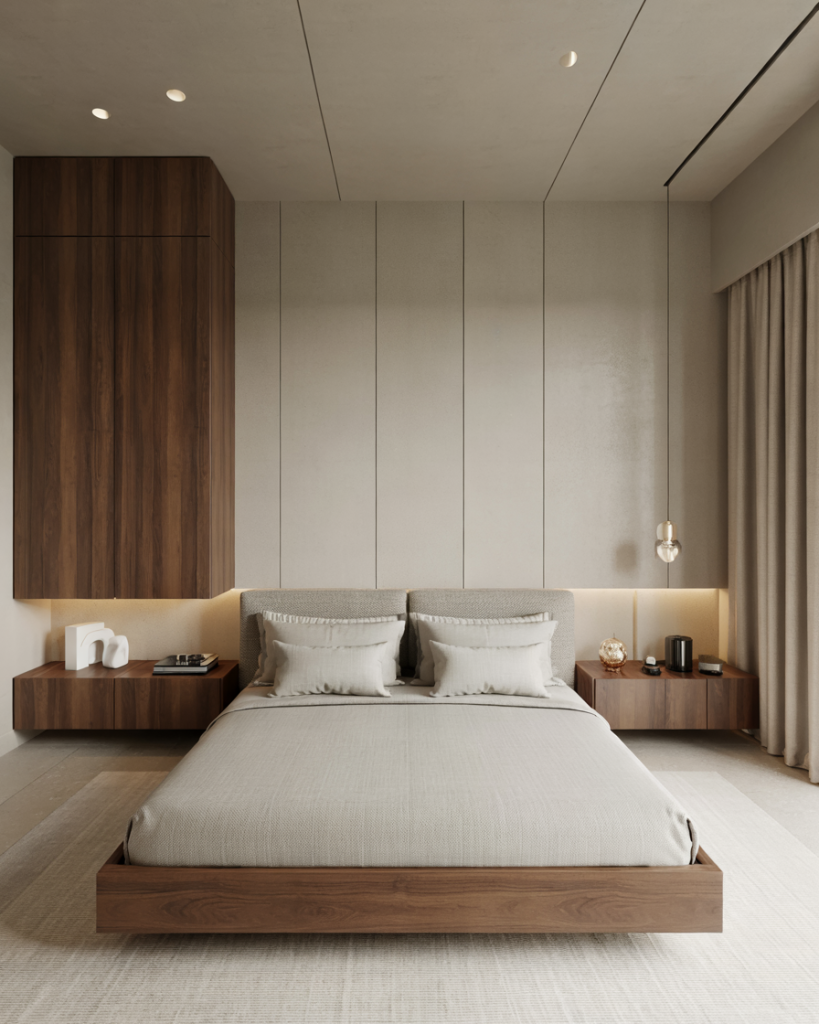 Functionality takes center stage in designing modern master layouts with concealed wardrobes, built-in lighting, and floating nightstands. Every detail hides clutter, maintaining open visual flow. This approach suits small apartments or simple modern homes where organization equals serenity. 2026 design means smarter, not larger.