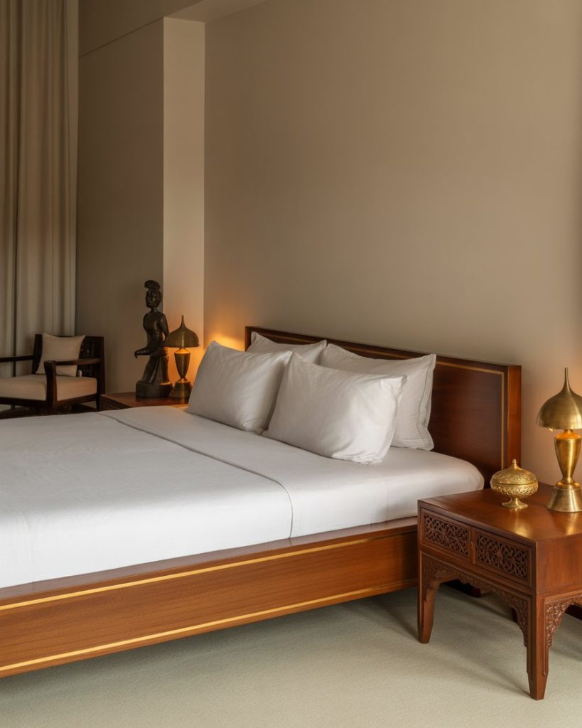 The new modern Indian bedroom combines teak wood, brass inlays, and soft earthy textiles with a clean layout. Its design is luxury and classy without being loud, celebrating heritage through craftsmanship instead of heavy ornament. Great for people who want culture and polish in the same room.