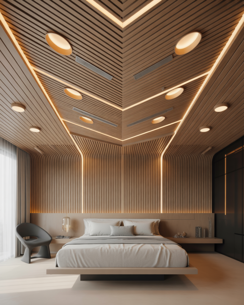 In 2026, the “fifth wall” finally matters. Modern trends in ceiling design include ribbed wood panels, LED halo light rings, and recessed curves that give height even in small rooms. The ceiling becomes architecture, not an afterthought, especially when paired with low platform beds and clean decor.