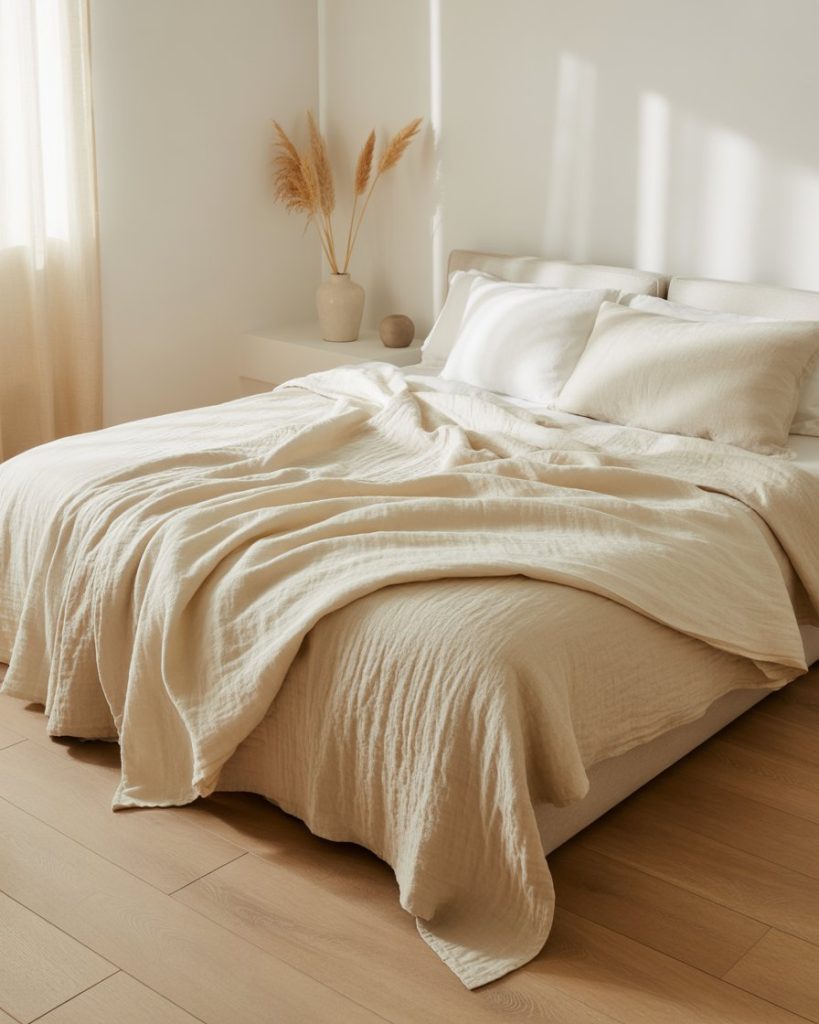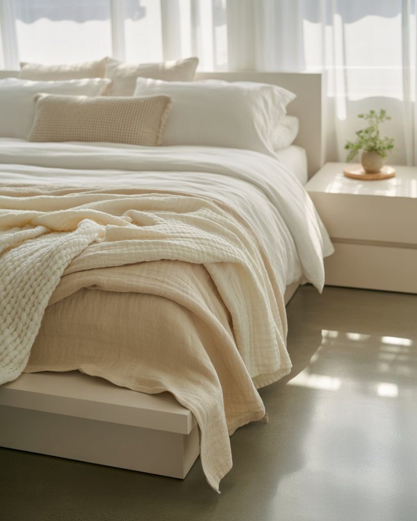 Texture becomes the new color in 2026. Wool, boucle, linen, and cotton layers define a cozy yet luxury-minded retreat. The secret is tone-on-tone depth—beige over cream, charcoal over slate—without visual noise. This look transforms even cold architecture into something deeply comforting, encouraging touch, rest, and peace.