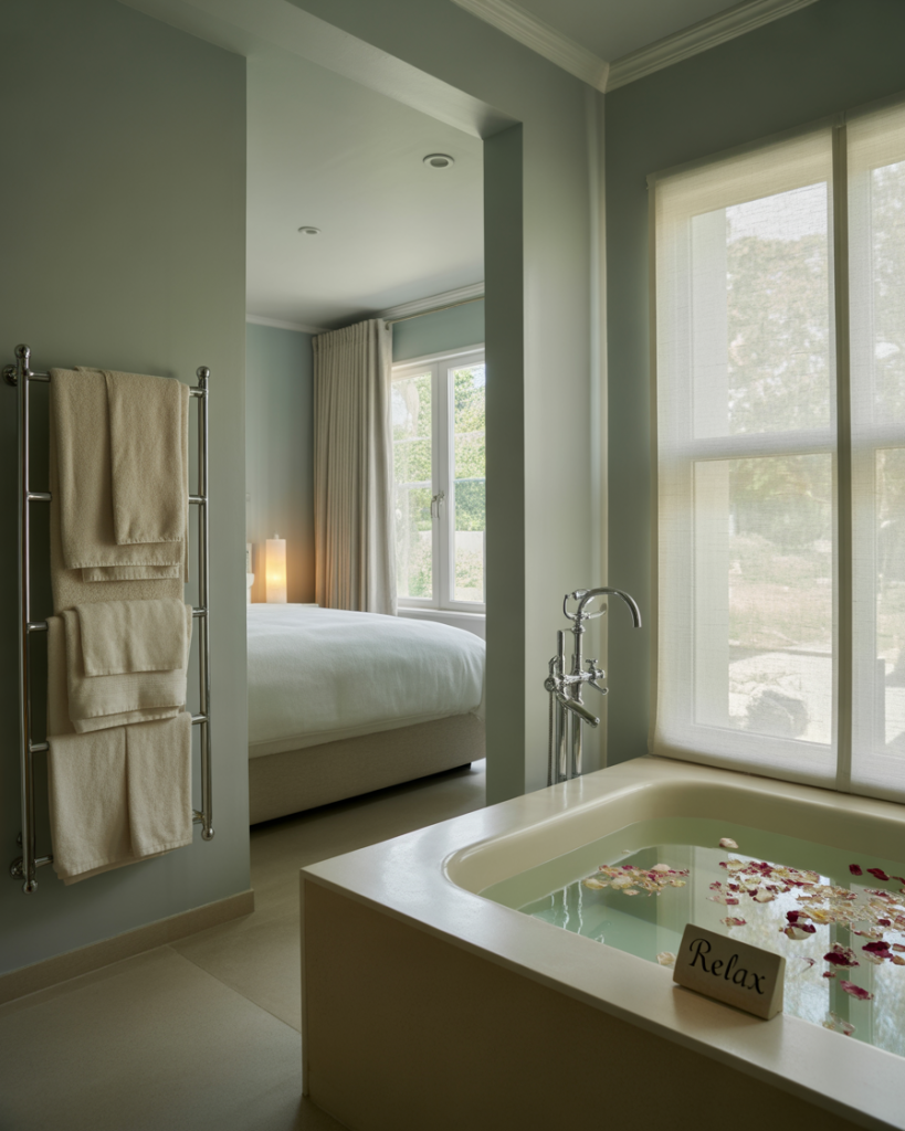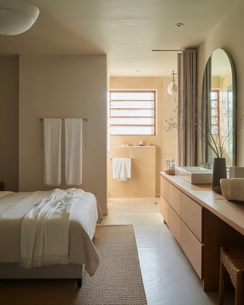 If your bedroom connects to a master bath, the design flow matters. Coordinating colors, textiles, and even materials between the two spaces creates harmony. Even cheap touches like matching towels and rugs make a big difference. I once stayed in a hotel where the seamless bedroom-to-bath design felt like a spa retreat—it reminded me that little details add up. Designers like Kelly Wearstler often emphasize the power of continuity in design.