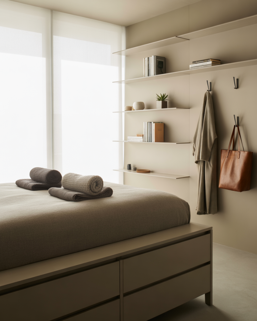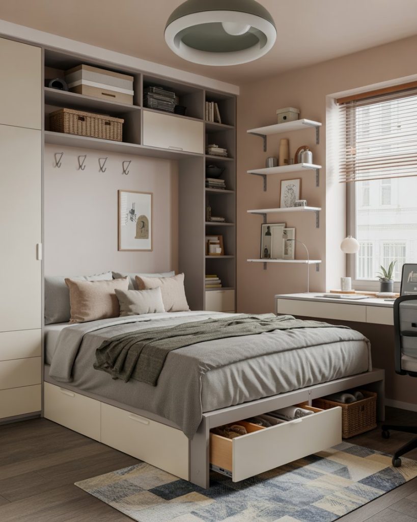 Bedrooms often double as storage spaces, and smart solutions make life easier. Built-in shelves, under-bed drawers, and wall hooks help keep things tidy even in a budget small room. For renter friendly fixes, opt for freestanding units or over-the-door organizers. I’ve seen incredible videos where people transform chaotic spaces into organized sanctuaries using simple storage tricks.