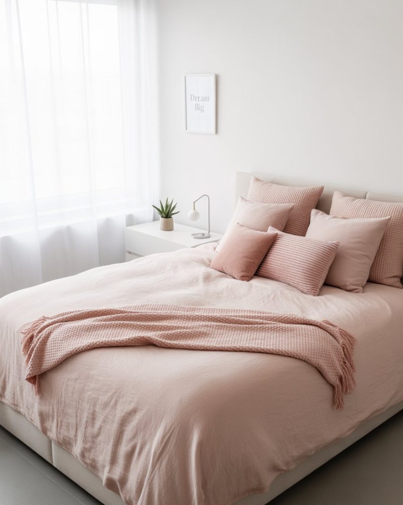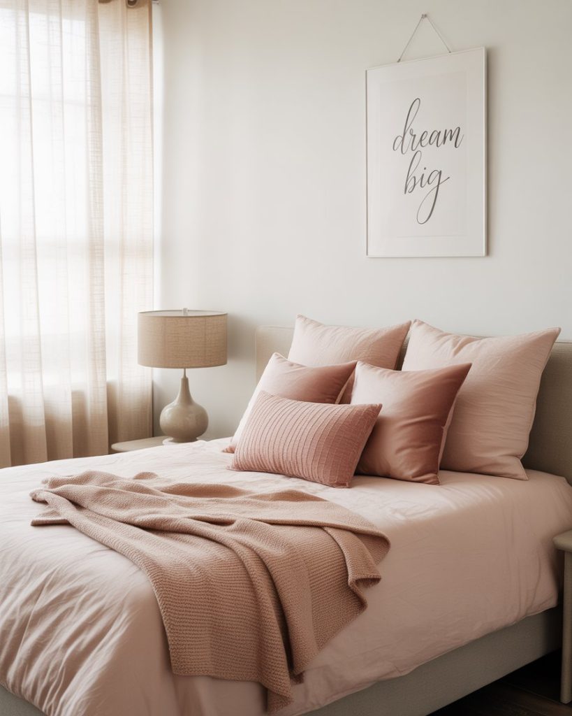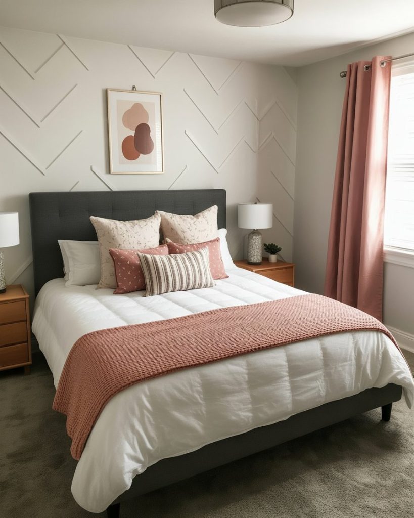 A splash of pink can completely refresh a dull bedroom. Whether it’s bedding, pillows, or a statement chair, pink adds vibrancy without overwhelming the space. This works especially well in a budget small room, where bold color creates interest. I remember painting just one wall blush pink in my niece’s room—it immediately turned it from bland to cheerful. Designers like Studio McGee often showcase playful accents that stay aesthetic and chic.