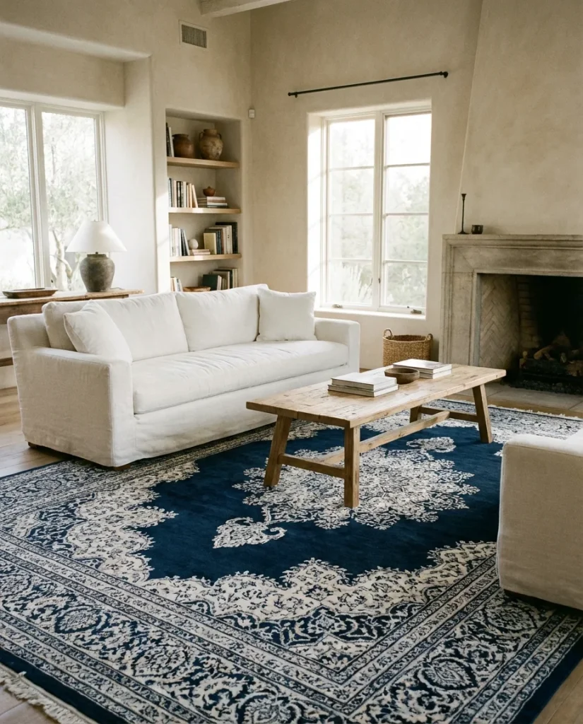 The most common mistake when choosing a living room rug is going too small—a rug that doesn’t extend under the front legs of the sofa will make your seating arrangement look like it’s floating in space. As a rule of thumb, your rug should be large enough that the front two legs of every major seating piece sit on it comfortably. In a blue and white room, this means the pattern becomes the floor-level foundation the entire design rests on.
