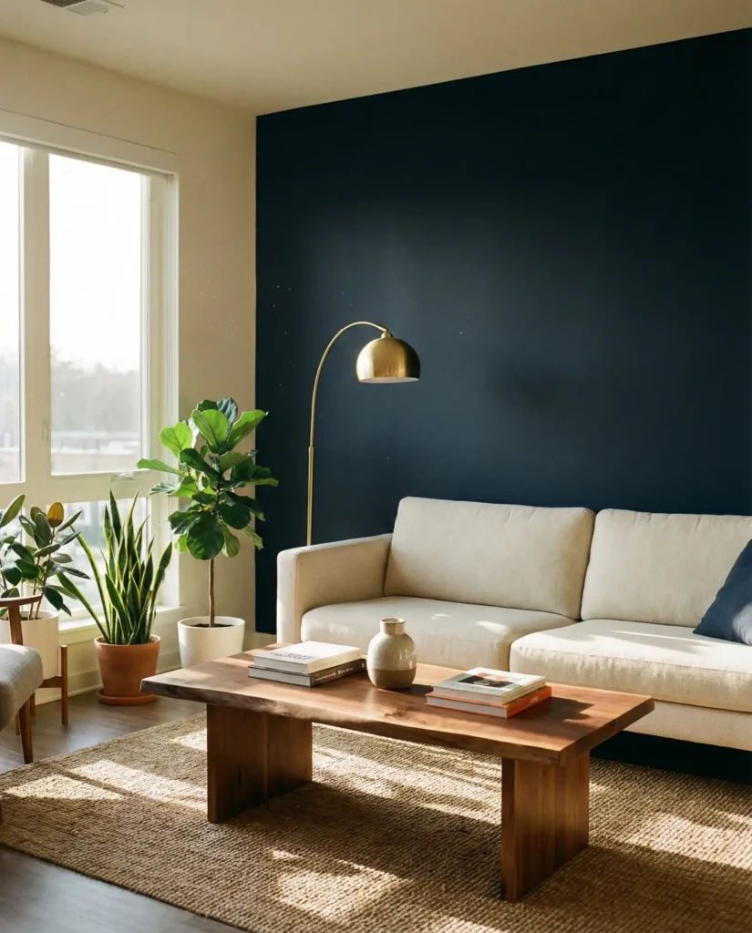 This approach works best in rooms with good natural light, as the navy wall absorbs brightness and needs balance. A common mistake is painting all four walls navy, which can feel heavy—stick to one feature wall and let the other three stay light. Many homeowners find this setup perfect for creating a focal point behind the sofa or fireplace, giving the room instant architectural interest without any construction.