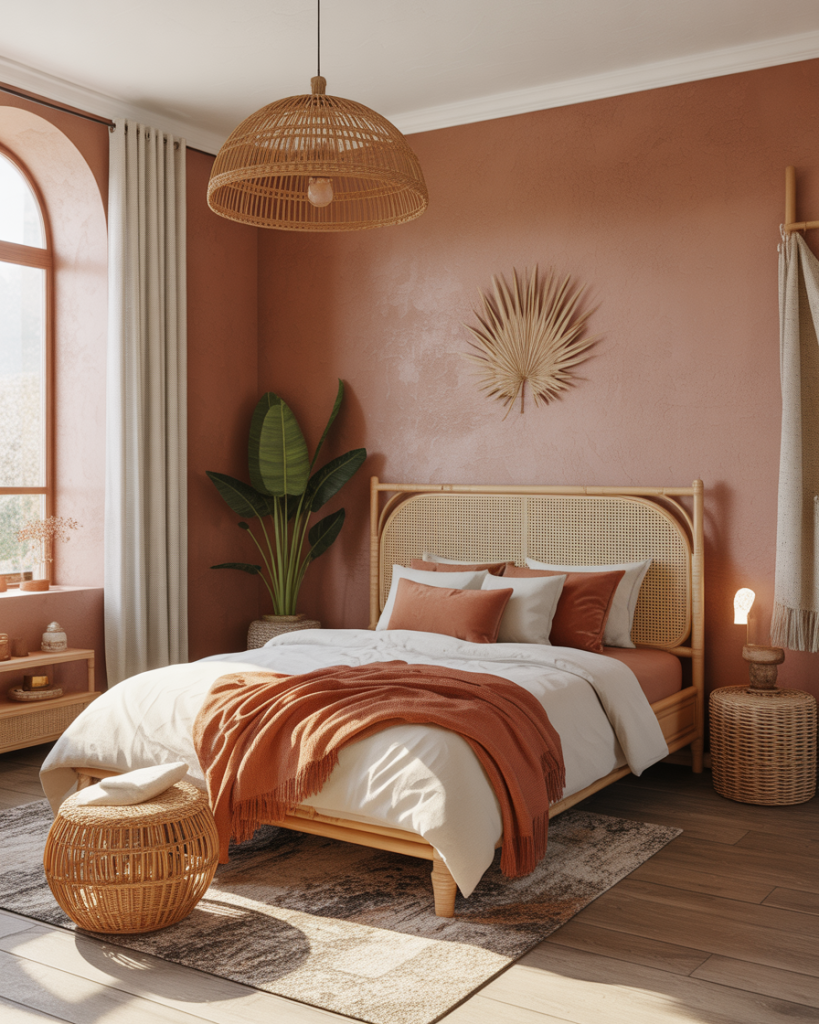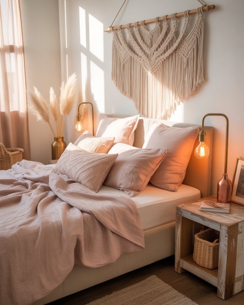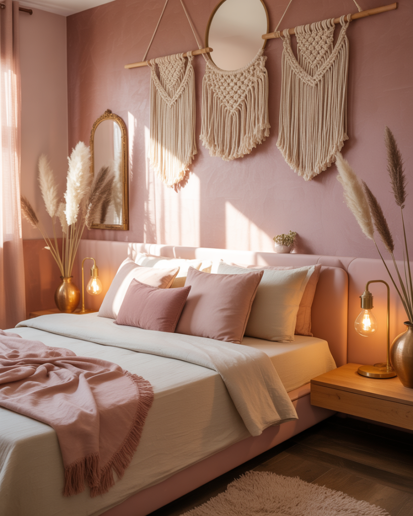 A pink boho bedroom combines whimsy and romance with a modern sensibility. Soft blush walls, macramé wall hangings, and linen sheets create a gentle ambiance. Gold or brass details can elevate the space to a subtle luxury. This color palette works especially well for small bedrooms, giving them an airy yet warm feeling.