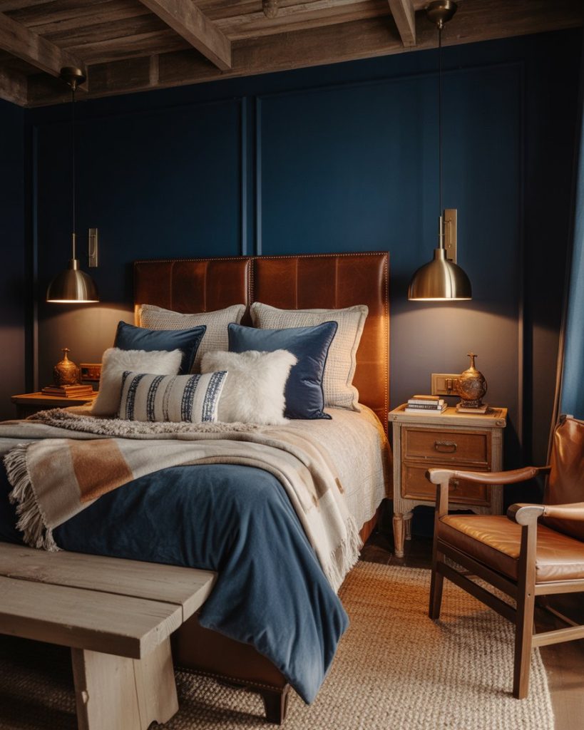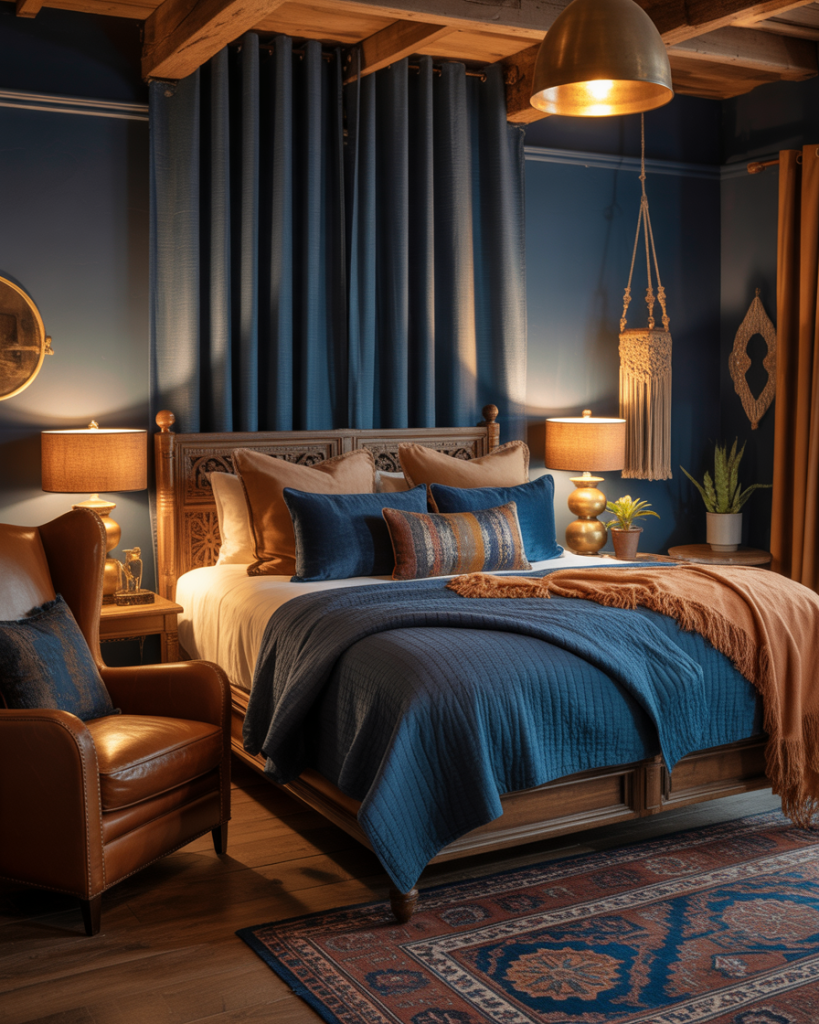 Merge western charm with navy blue sophistication for a unique luxury boho retreat. Use leather accents, woven wool rugs, and wood-paneled walls to add depth. Brass lamps and velvet cushions soften the look, making it both rugged and refined—a blend of cowboy spirit and modern comfort.