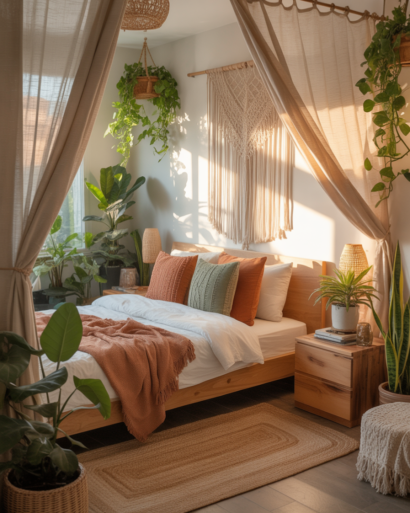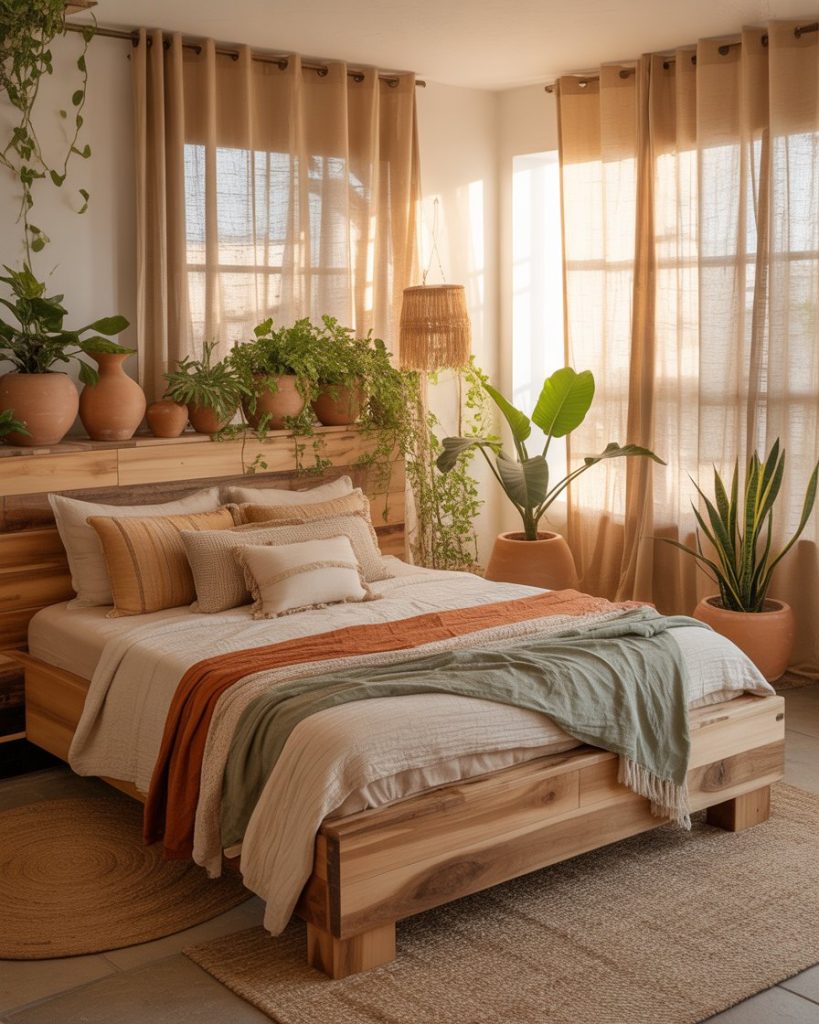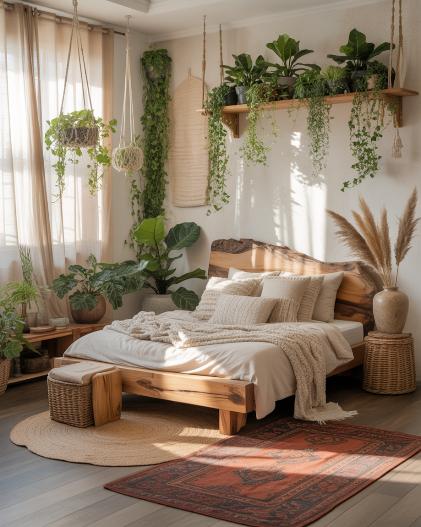 A rustic, earthy boho bedroom blends natural materials and organic comfort. Weathered wood furniture, woven blankets, and terracotta pots add timeless texture. Neutral tones pair beautifully with handmade ceramics and linen drapes. This design feels warm, grounded, and deeply personal—like a cabin retreat in the heart of the city.