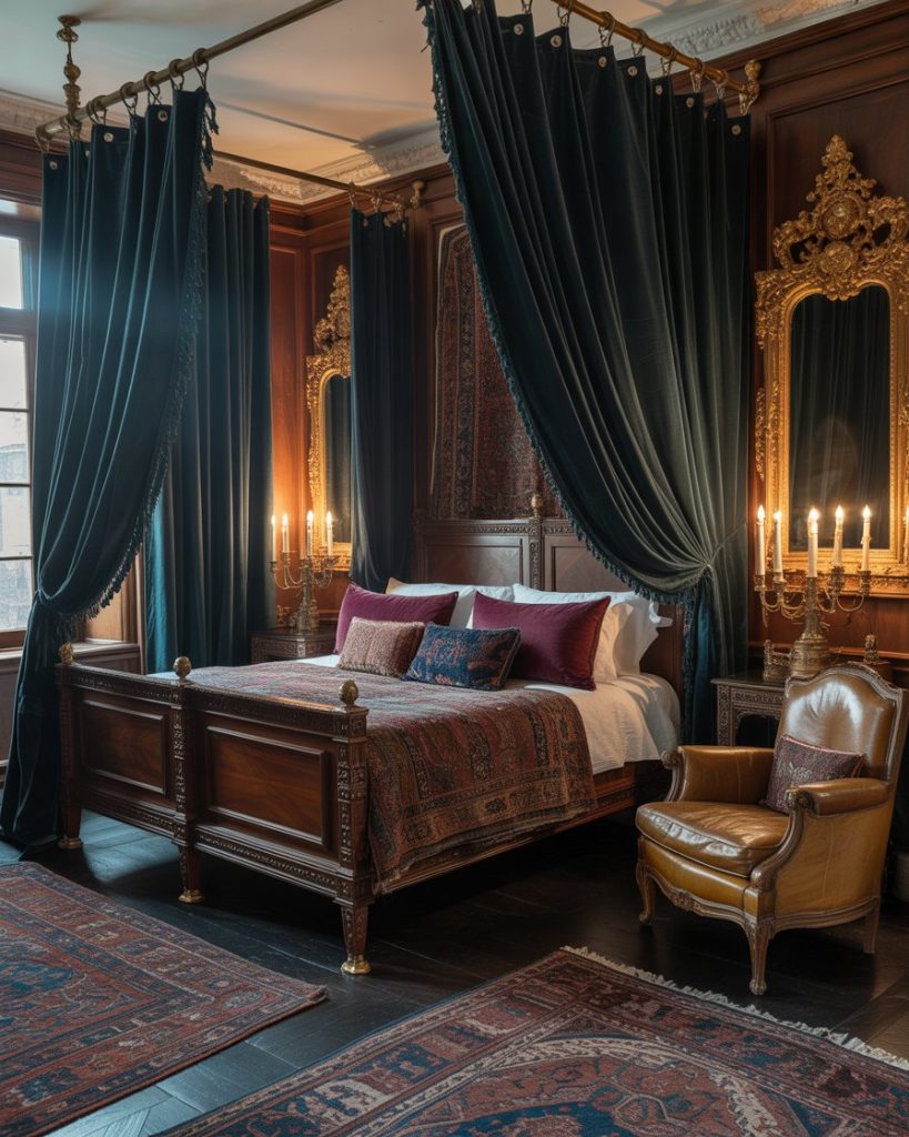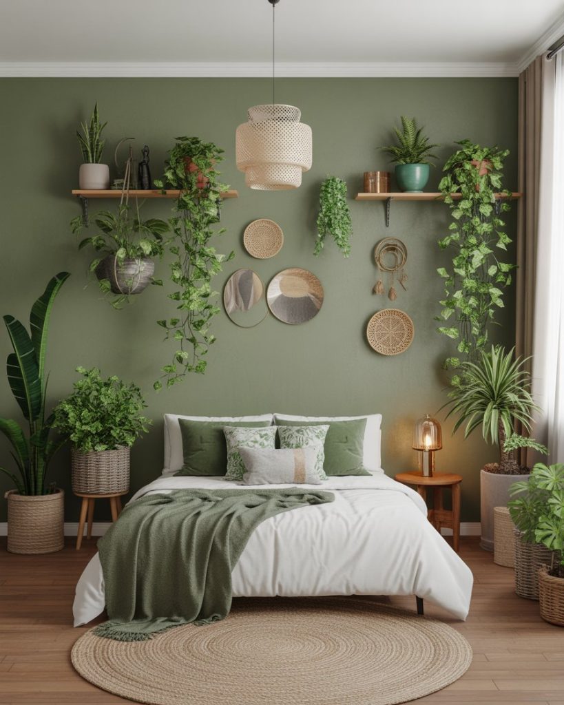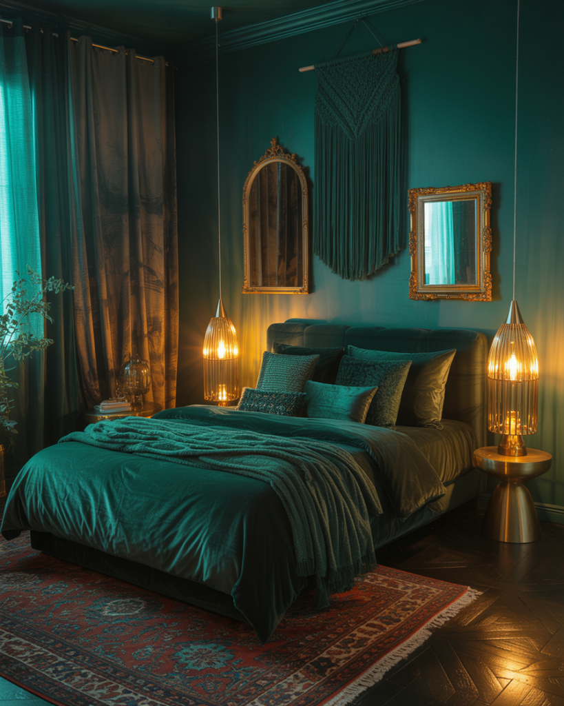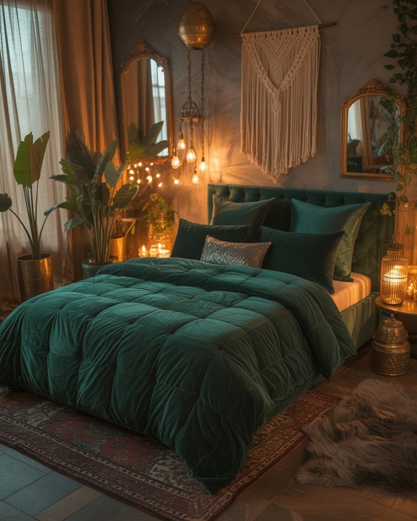 Combine moody tones with green shades for a mysterious yet luxurious retreat. Emerald bedding, dark walls, and gold-framed mirrors create a dramatic contrast. Layer textures like velvet and silk for a sense of indulgence. It’s a style that whispers sophistication while maintaining the soulful Boho essence.