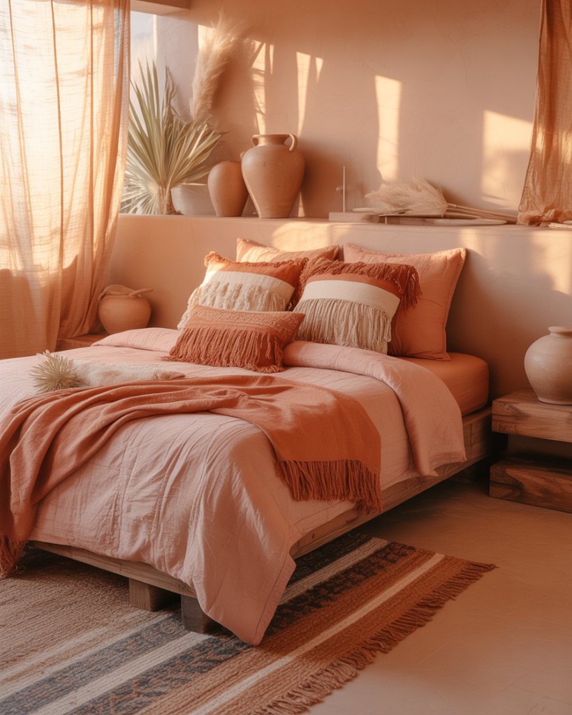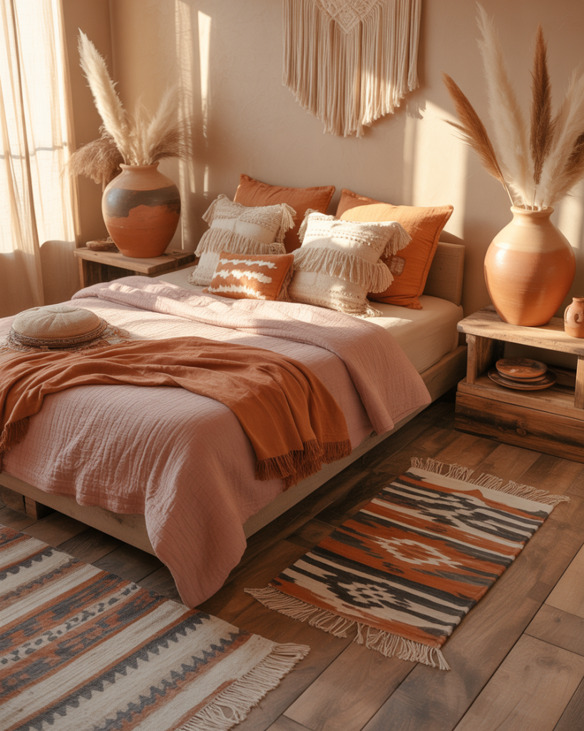 Inspired by the Southwest, a western boho bedroom radiates warmth and soul. Clay pink, burnt orange, and beige shades evoke desert landscapes. Add woven rugs, pottery, and fringe pillows to complete the scene. The combination feels adventurous and soothing, ideal for those who dream of open skies.