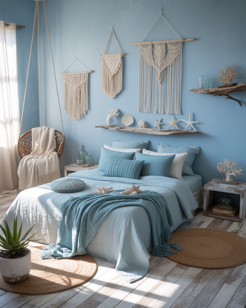 A blue Boho bedroom channels the serenity of the sea and sky. Layering turquoise textiles, patterned cushions, and woven wall hangings evokes freshness. Driftwood and seashell accents tie the theme together. This coastal design feels refreshing every morning, like a deep breath of ocean air.