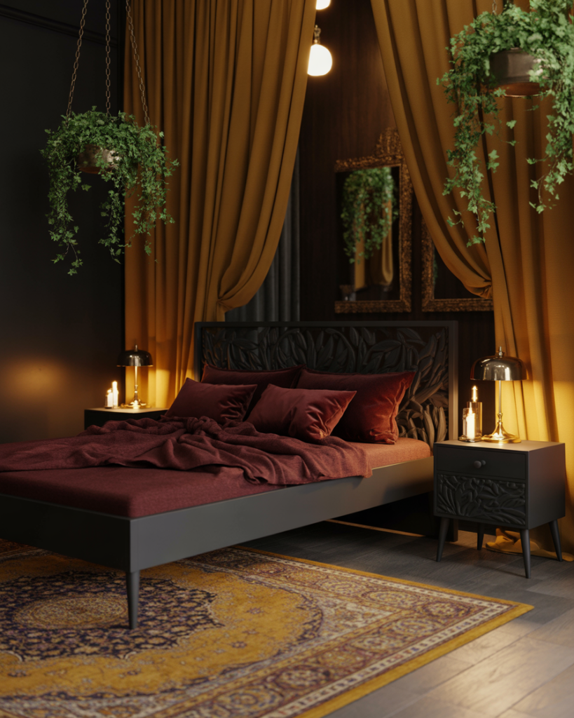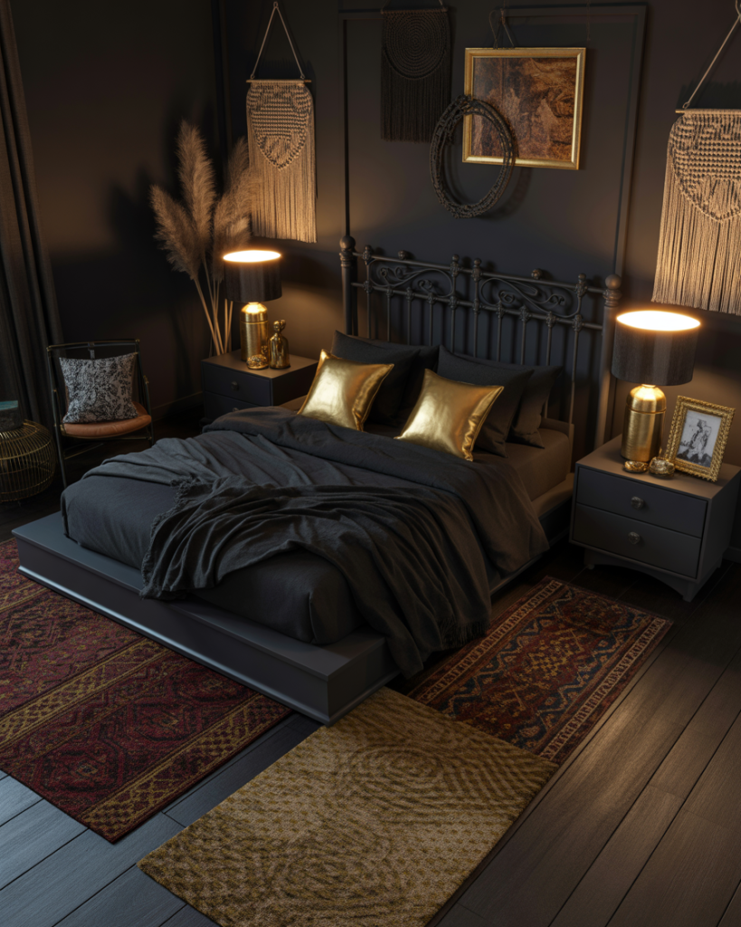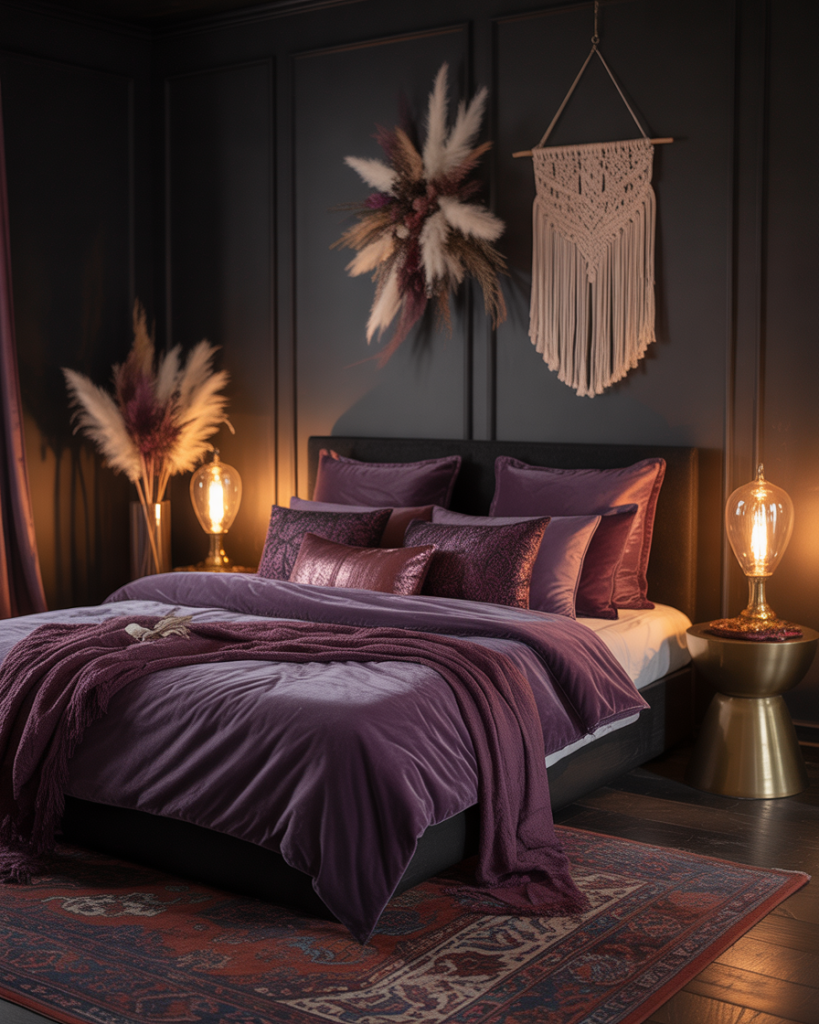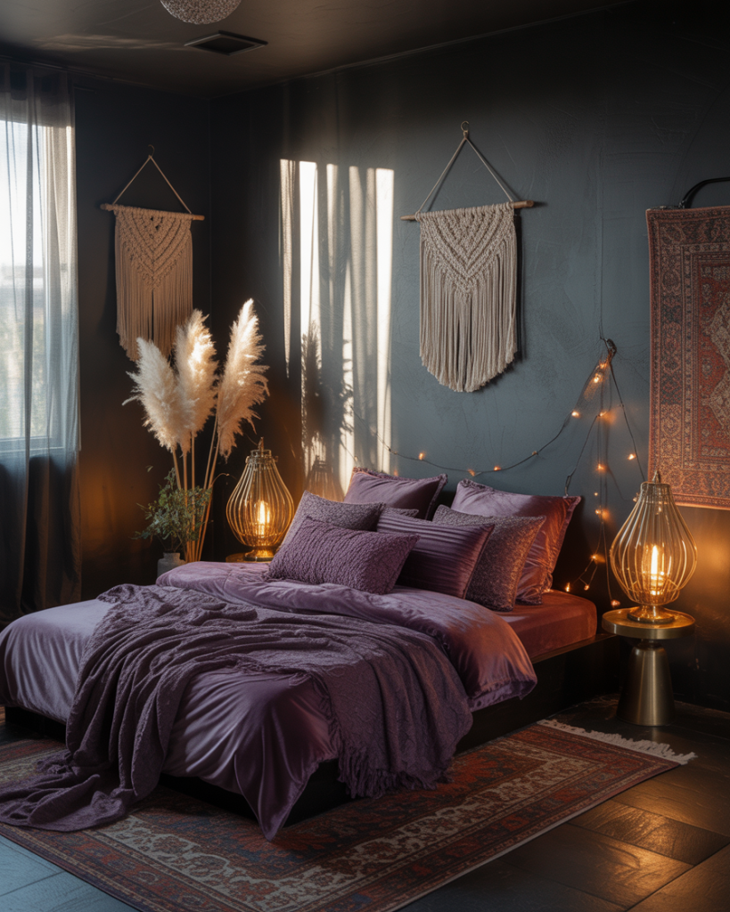For those who adore intimacy and mystery, a dark boho room sets the tone. Think black walls, golden lamps, and purple bedding with rich textures. The play of shadows adds allure, while the decor remains deeply personal. It’s a perfect escape for quiet thinkers and dreamers.