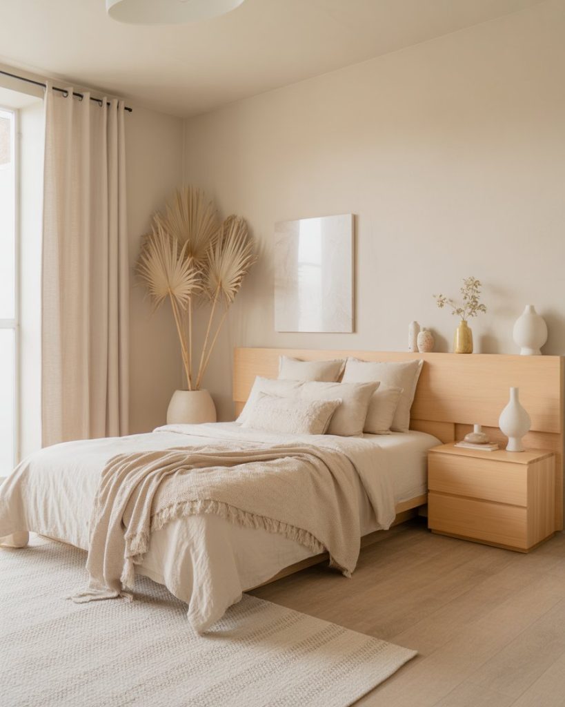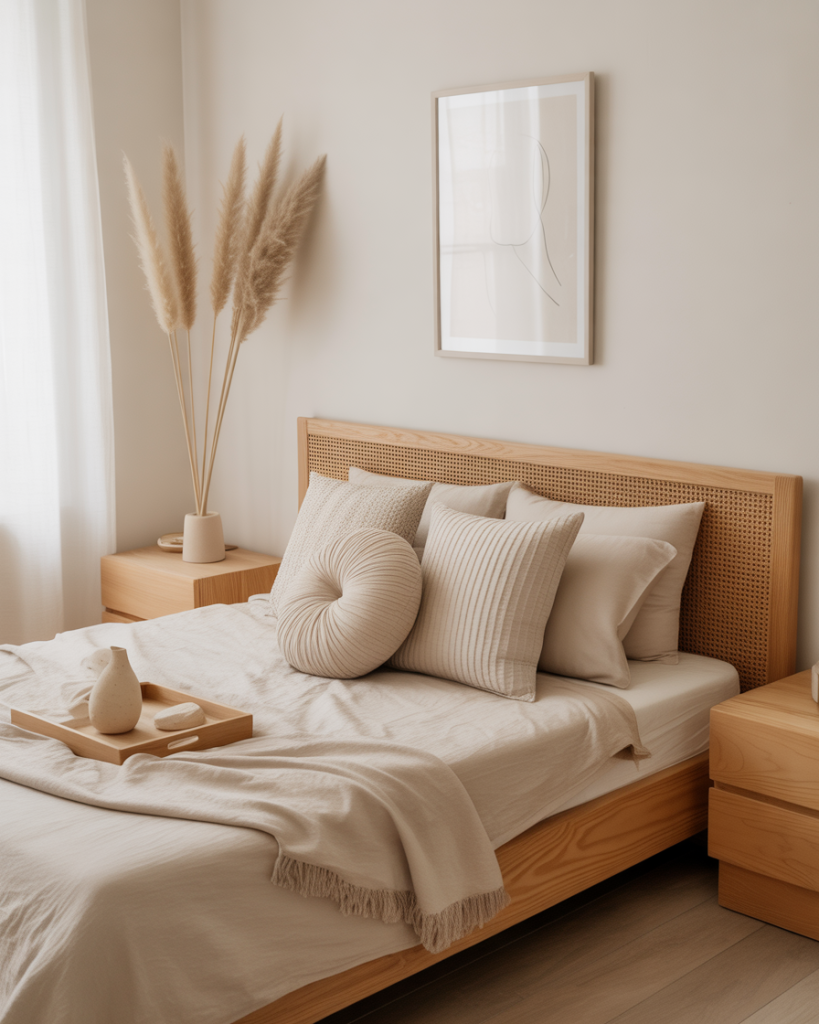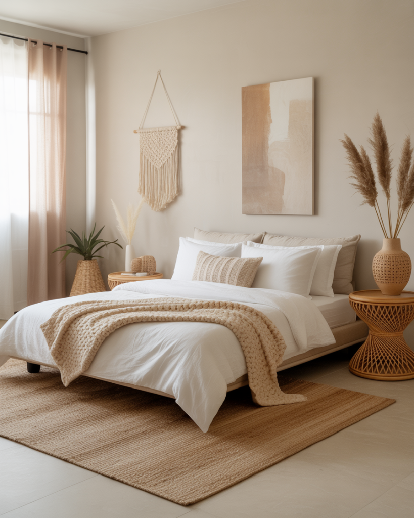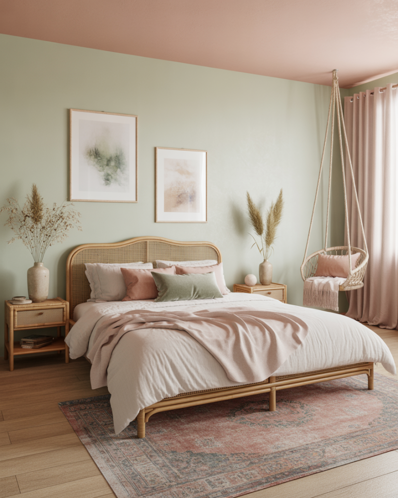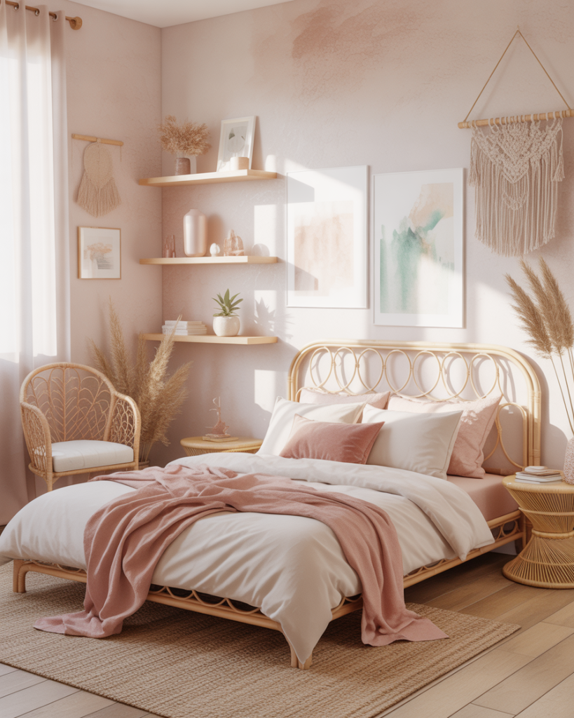 A pastel aesthetic A boho bedroom brings softness and peace. Light tones of mint, blush, and cream pair with rattan chairs and cotton bedding. Add handmade ceramics or wall art for a gentle creative touch. Perfect for those who crave simplicity and comfort in equal measure.