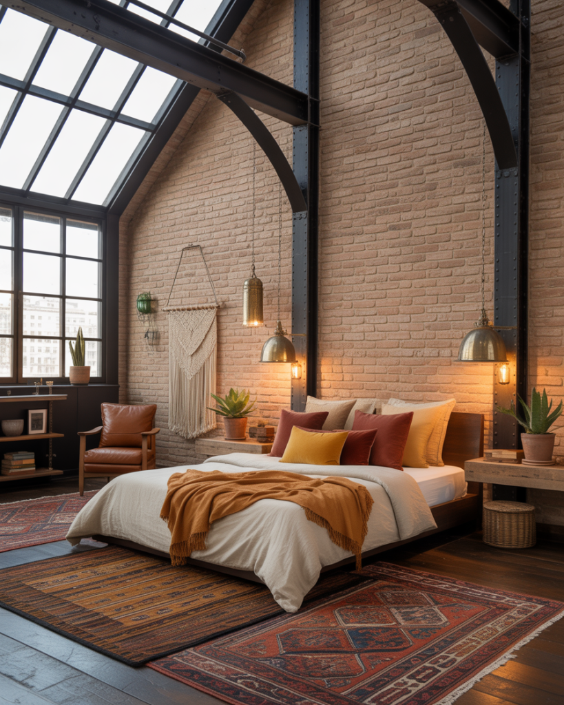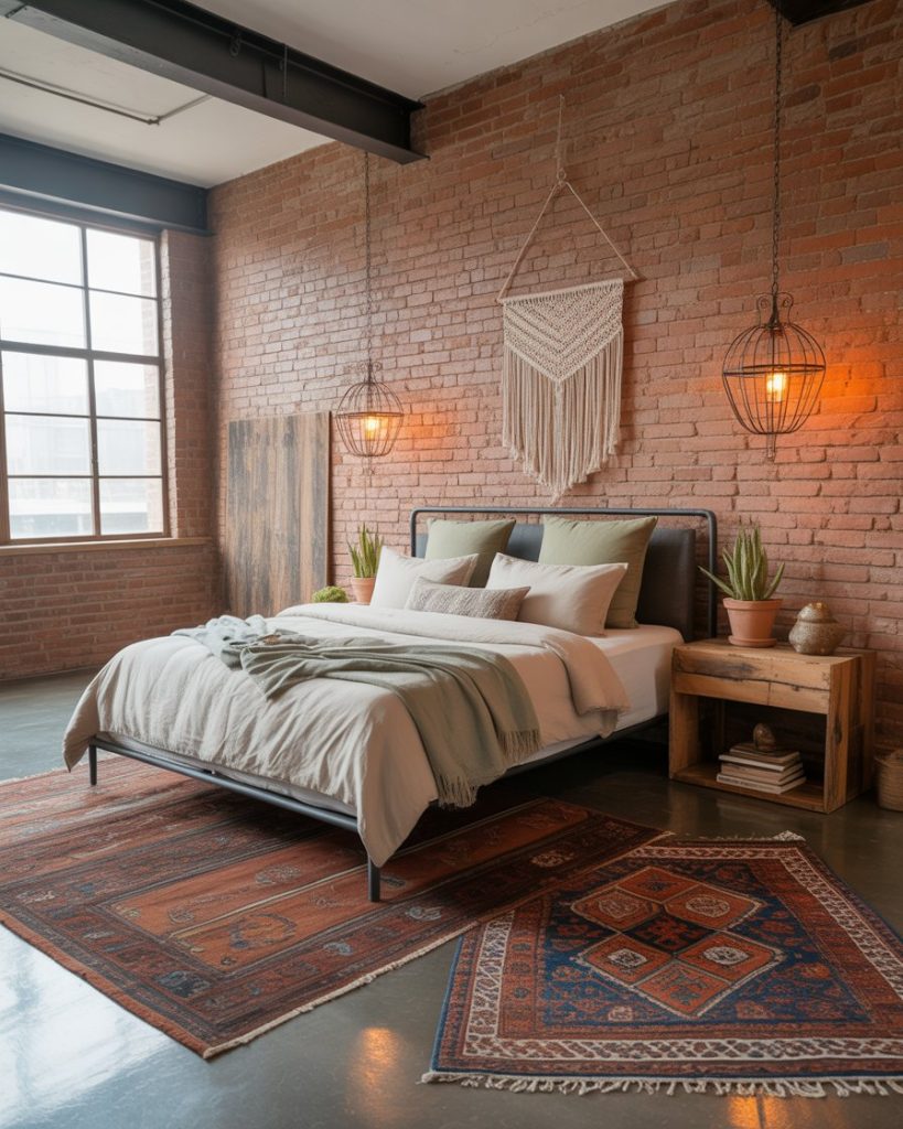 The new Boho style offers a wonderful opportunity to merge earthy and modern styles. The contrasts of exposed brick walls with metal lighting and decorative carpets are striking. To balance the space, warm elements, such as macramé pieces and linen bed covers, work wonderfully. This style achieves a nice blend of the raw energy of the city and homely warmth.
