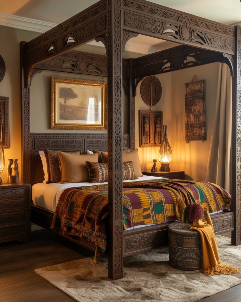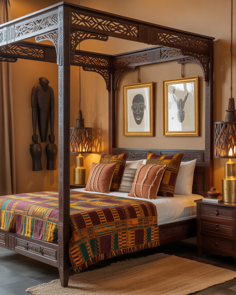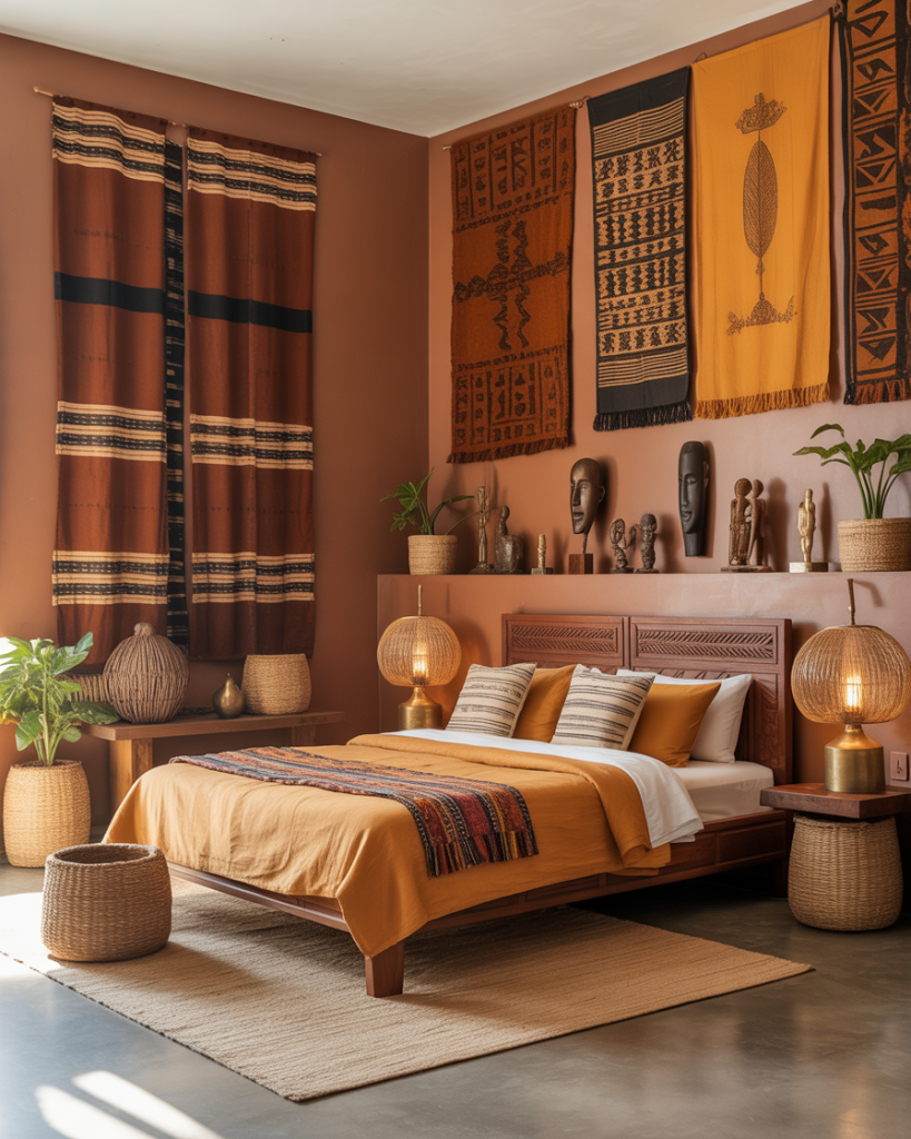 An Afro-aesthetic boho bedroom celebrates global heritage and bold patterns. Earth tones, tribal prints, and handcrafted decor express individuality and pride. Woven baskets from African artisans and bright textiles create a rich, layered design that tells a story of culture and identity.