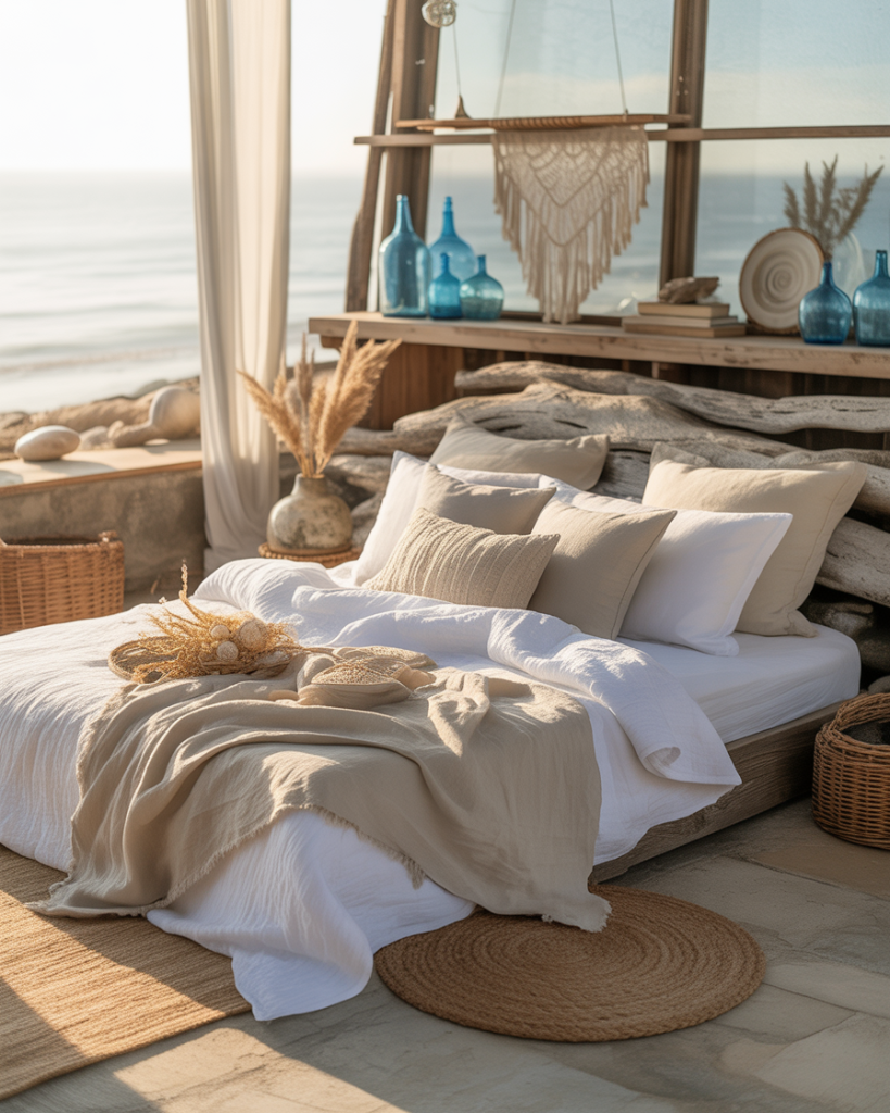 A beachy, coastal Boho bedroom brings the ocean breeze indoors. Whitewashed furniture, driftwood, and linen curtains evoke seaside tranquility. Shades of blue and sand pair beautifully with woven textures and seashell details. It’s ideal for those dreaming of endless summer days and peaceful mornings by the water.