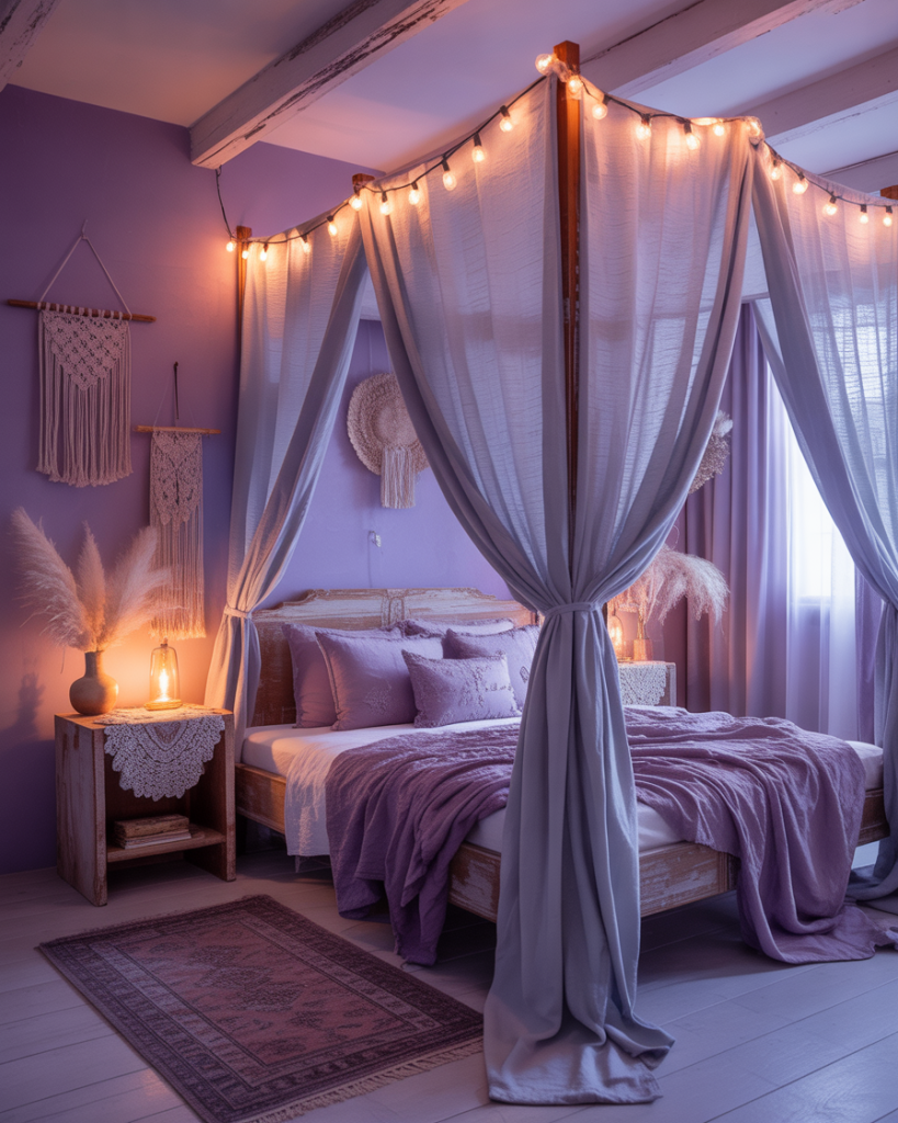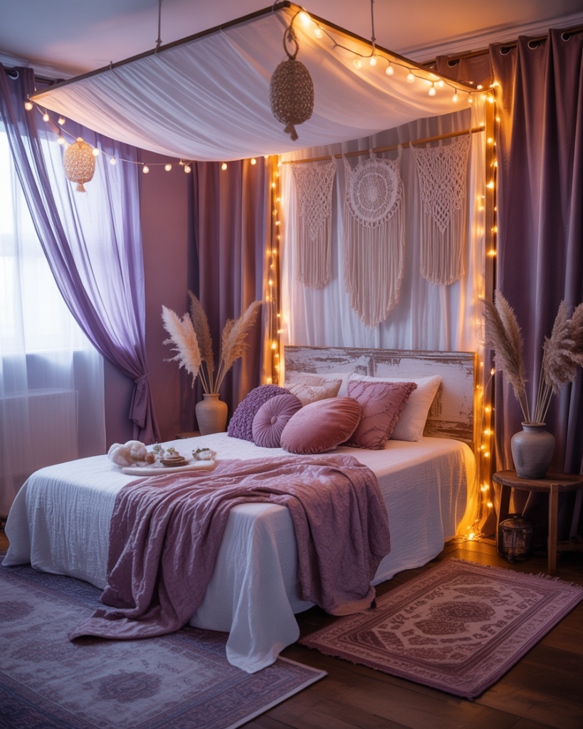 Create a soothing lavender or purple boho escape inspired by calm and creativity. These hues bring spiritual and emotional balance, especially when paired with vintage lace and dried flowers. Add fairy lights or a canopy for a dreamy ambiance that feels both youthful and serene.