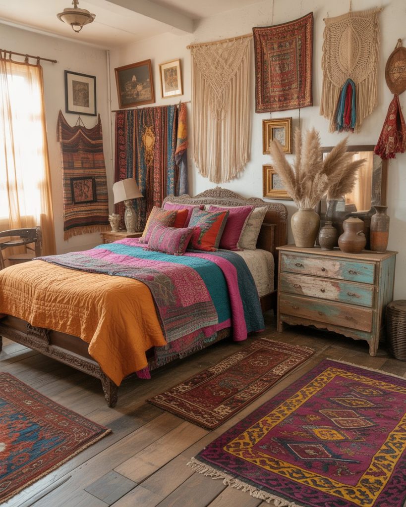 The vintage colorful Boho approach celebrates individuality through a mix of old and new. Combine antique furniture with handmade throws, mismatched cushions, and art from flea markets. The result feels authentic and full of life—perfect for creative souls who enjoy layering memories into their surroundings.