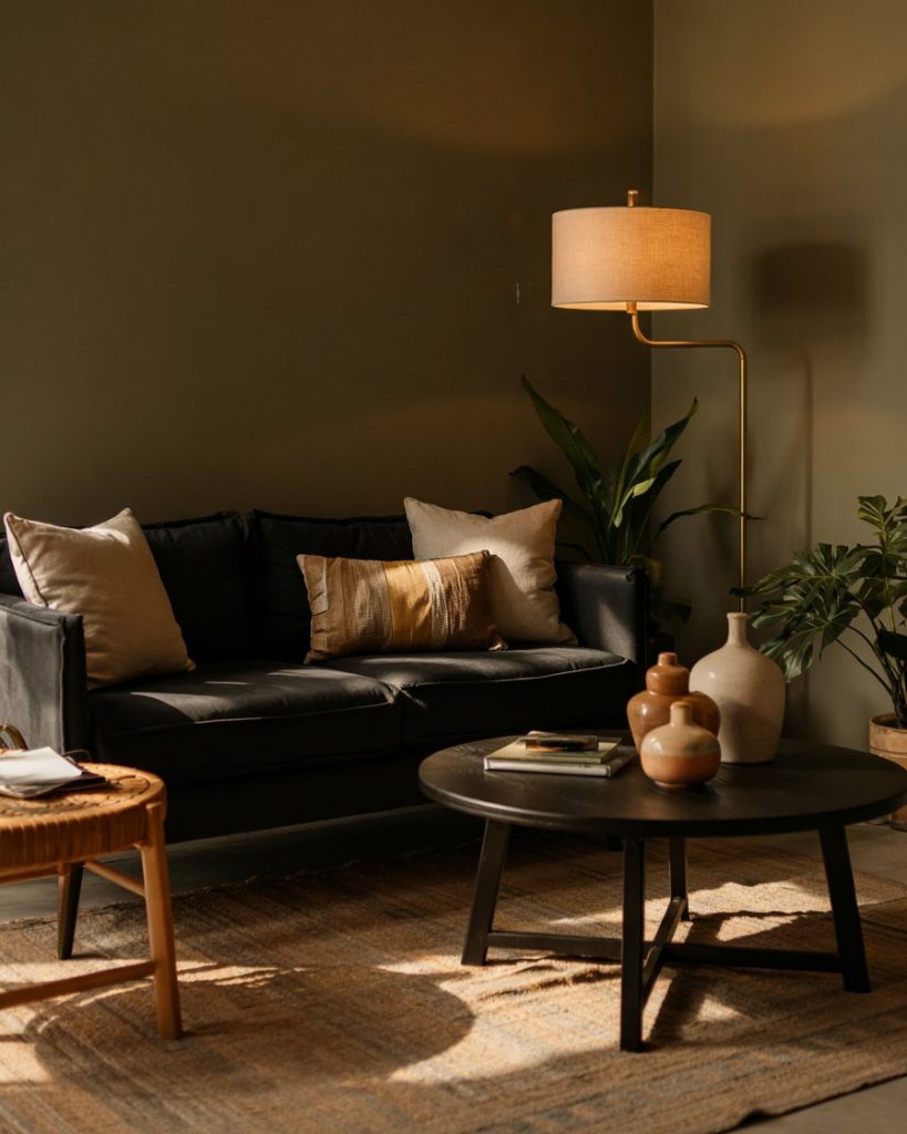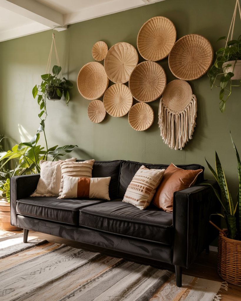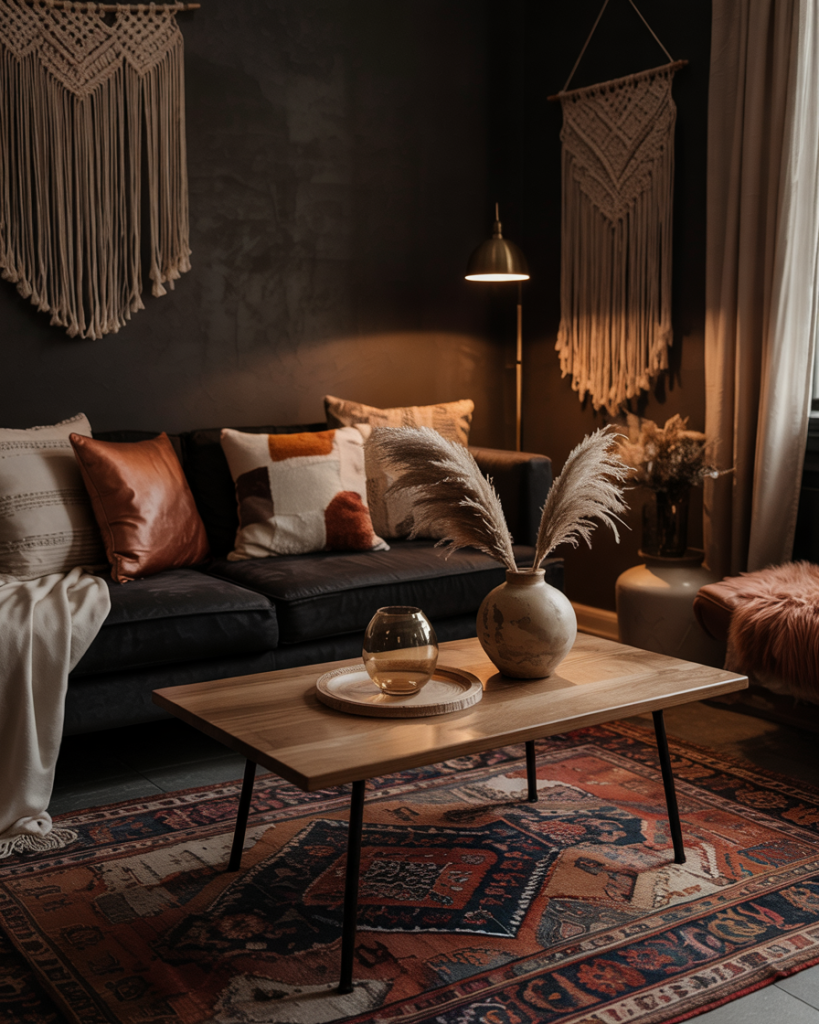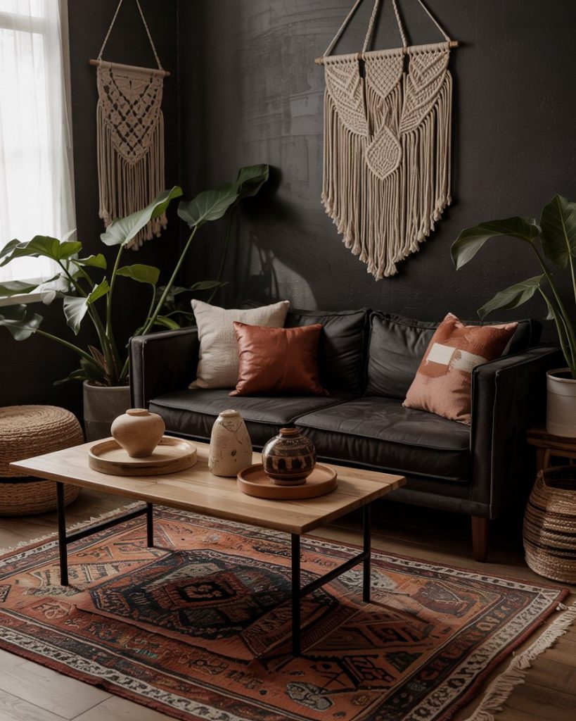 This concept leans into a dark, atmospheric palette with deep greens, charcoals, or rich navy backgrounds paired with textured layers and global accents. Think of a room where a robust black couch anchors the space, accented by earthy baskets, vintage rugs, and bold art pieces. I once visited a loft where the designer used moody charcoal walls and brass lighting to give the boho aesthetic a dramatic edge—while still feeling cozy and lived-in.