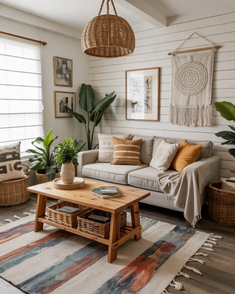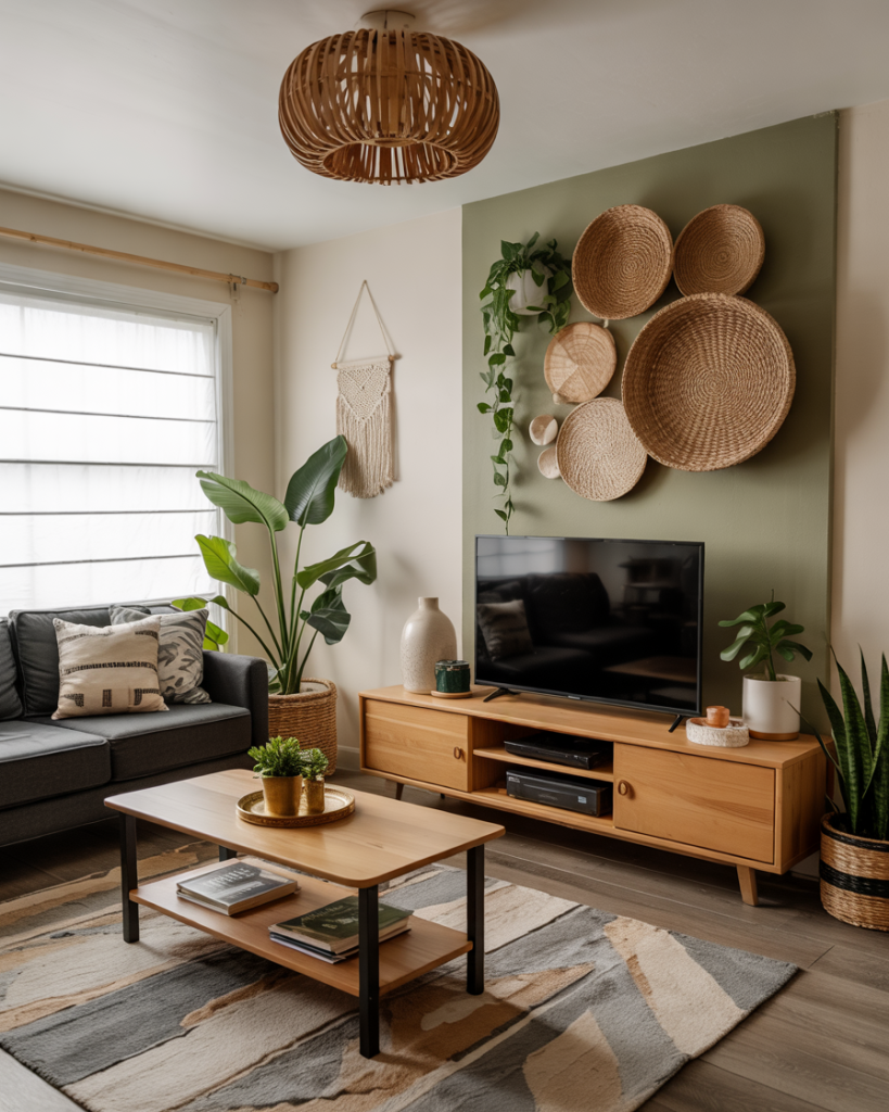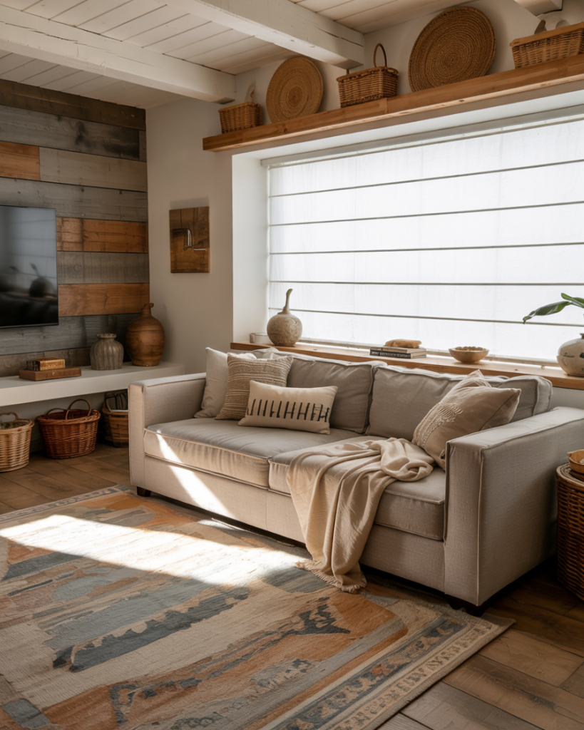 Blend modern simplicity with farmhouse warmth: clean lines meet rustic wood and woven baskets. Add an open TV wall with floating shelves for function and beauty. A designer friend in Texas calls this “boho with backbone”—structured but heartfelt.