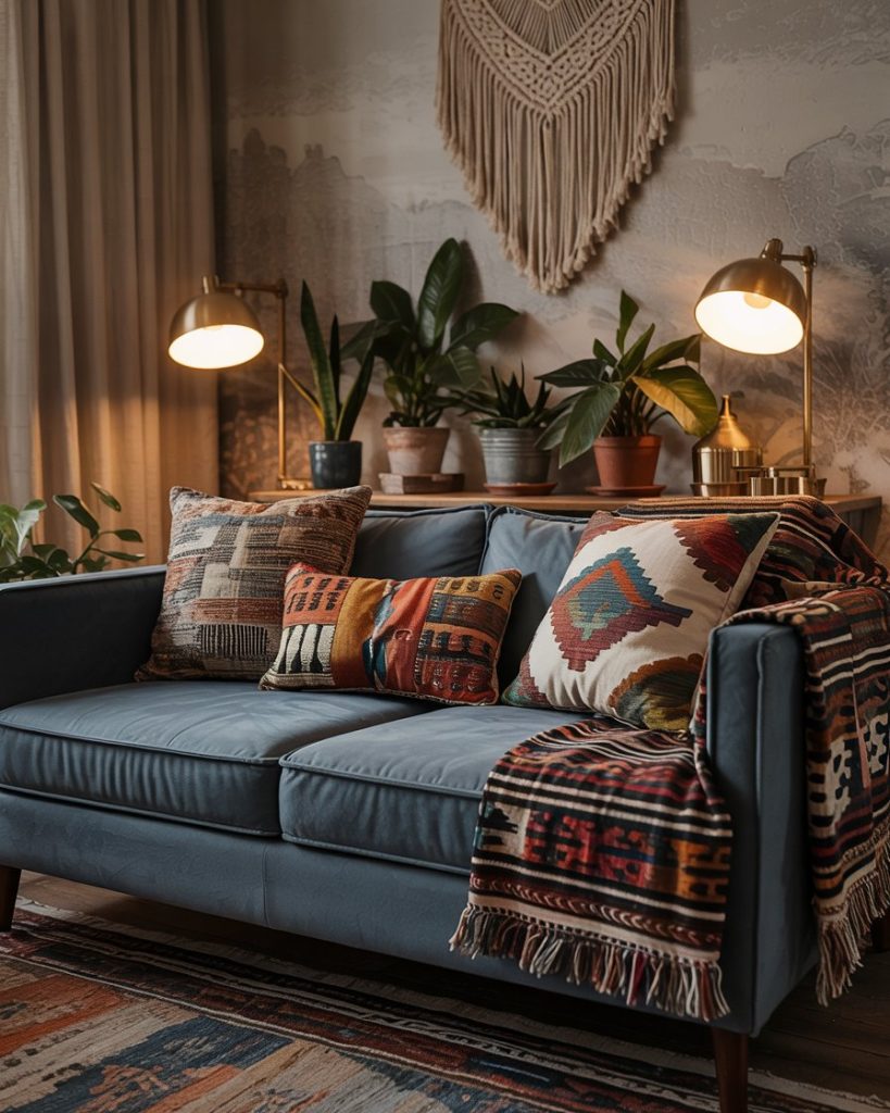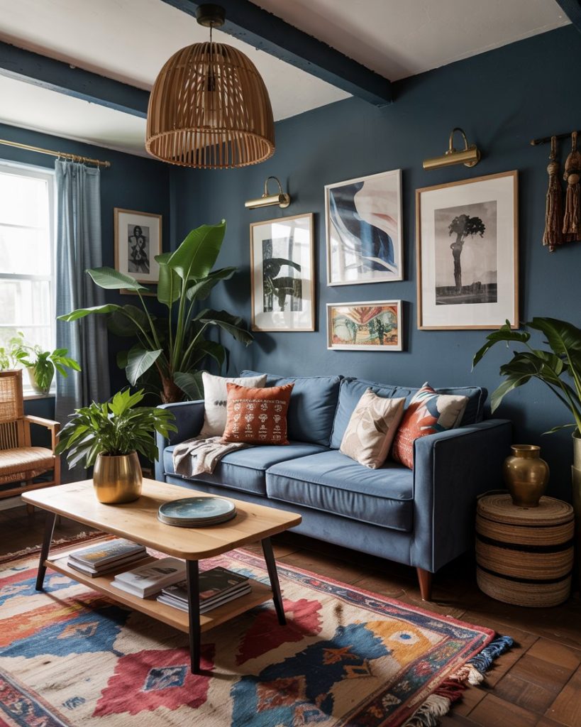 A moody boho living room with rich blue undertones feels dramatic yet soothing. Pair deep indigo walls with a blue couch, brass lamps, and vintage textiles. I once helped redesign a small apartment where the homeowner painted one wall navy and added Moroccan lanterns—it instantly became their favorite evening retreat.