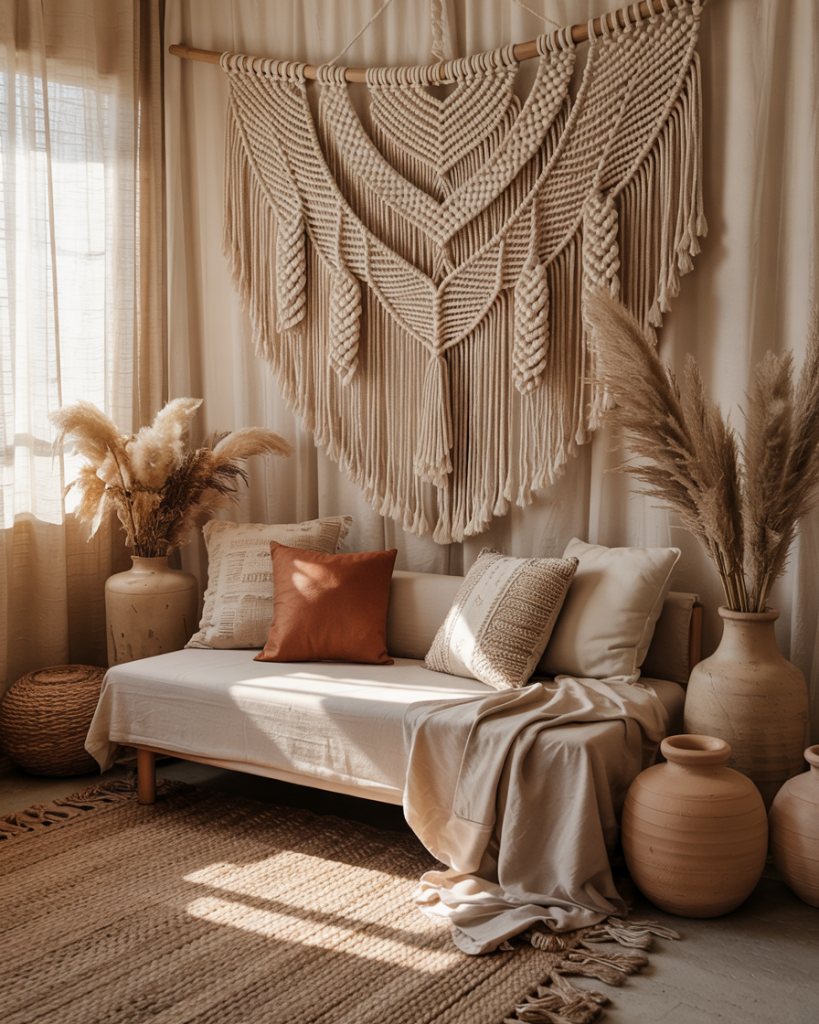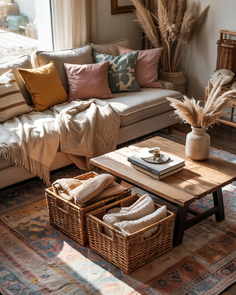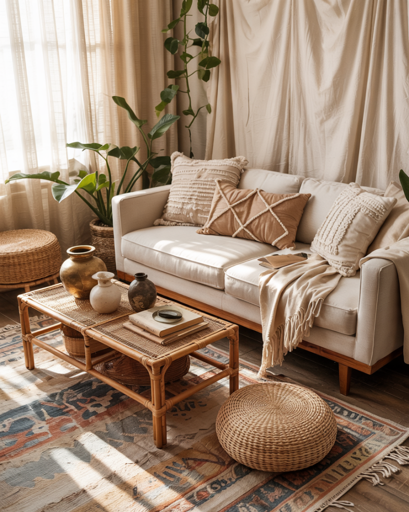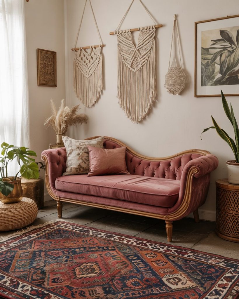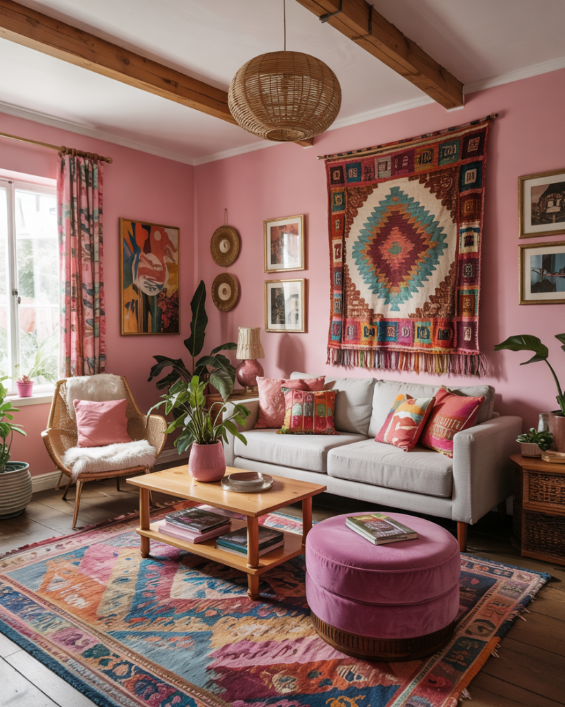 Soft pink tones paired with earthy beiges and creamy whites create a gentle, feminine boho vibe. Picture blush pillows, a natural jute rug, and gold lighting accents. When I visited a designer’s studio in LA, her pale pink textiles and wicker decor brought instant calm without losing personality.