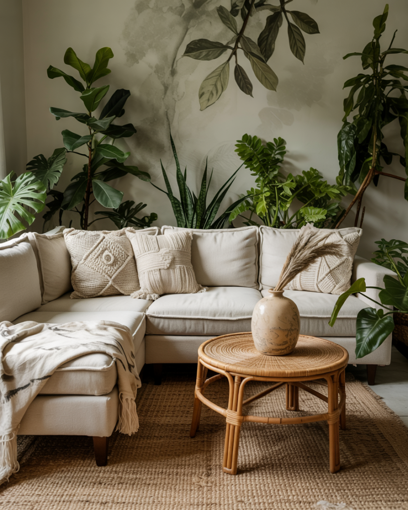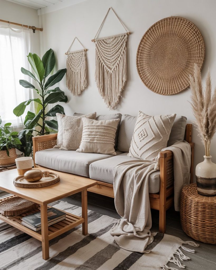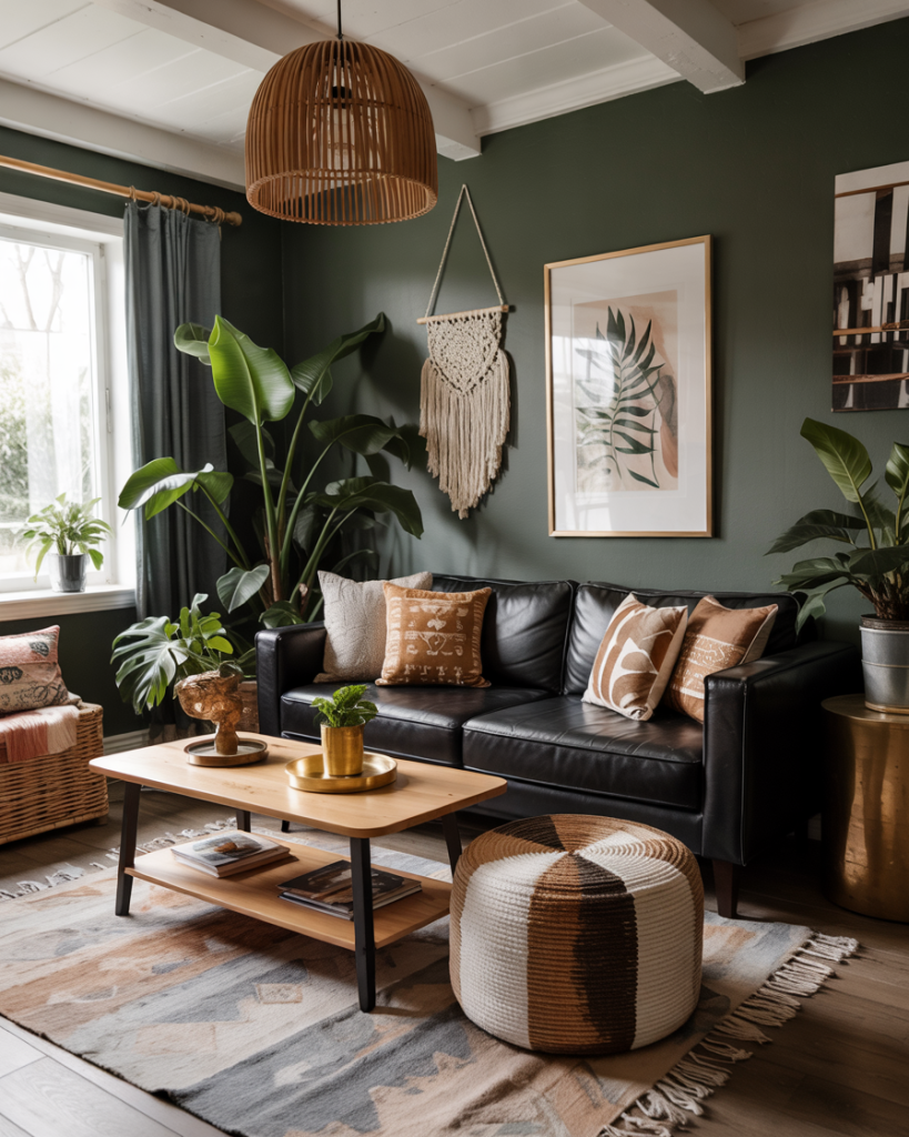 Bring nature indoors with lush green hues and houseplants. This cozy boho idea mixes hanging greenery, rattan furniture, and macramé plant holders for organic charm. A friend once told me her living room feels “alive” since she added plants to every corner—proof that nature never fails to inspire.