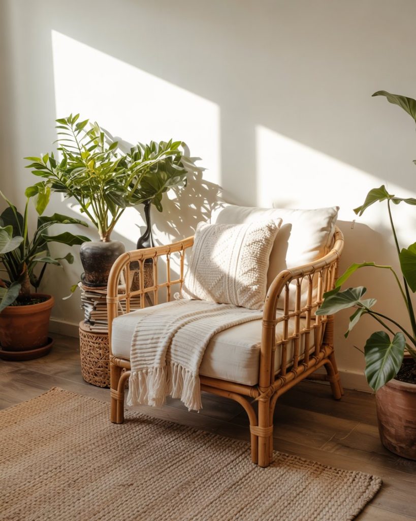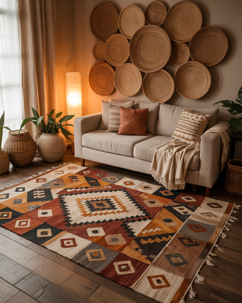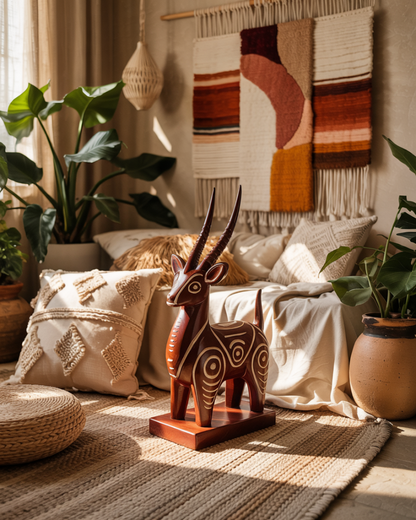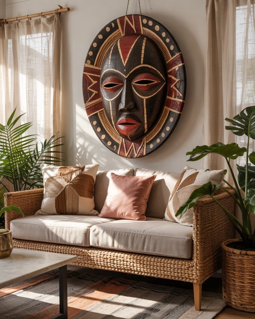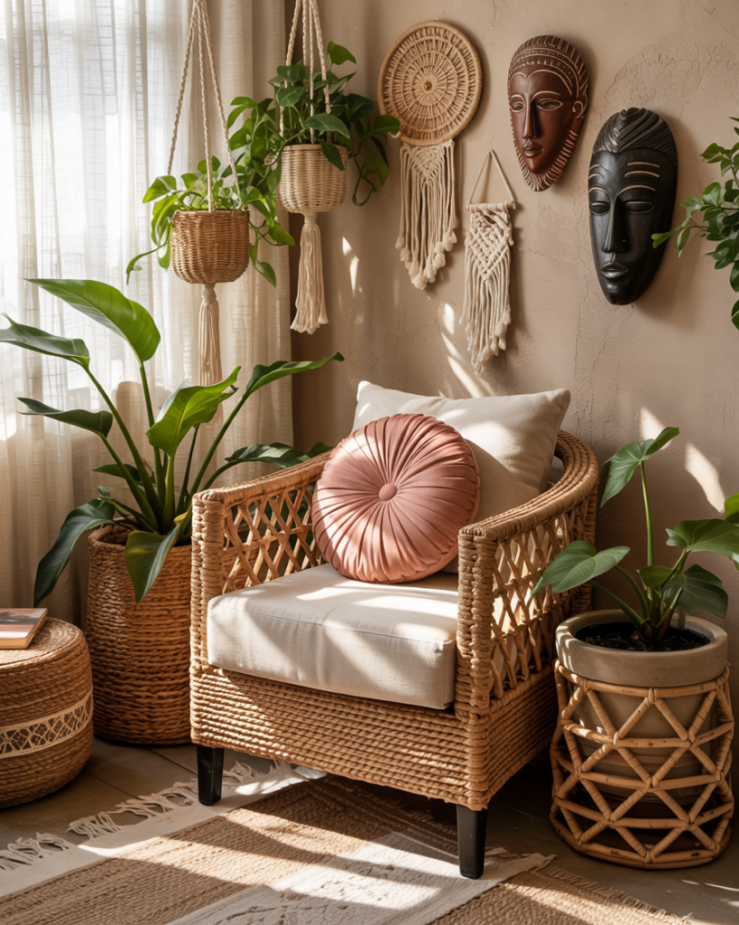 In this style, the focus is on Afro patterns, African art and textiles, natural jute and basketry, with boho’s inherent layering and personal storytelling. I visited a residence where the owner displayed masks and woven mats from West Africa and added a pink pillow and plants—bringing culture, warmth, and individuality together.