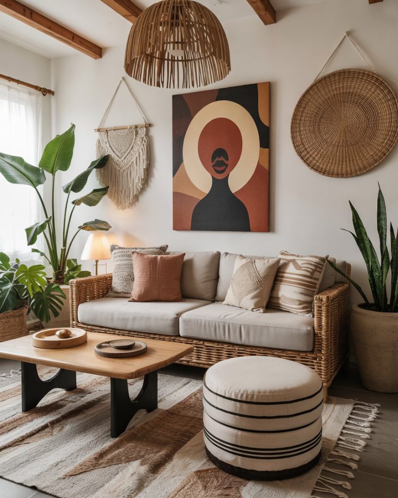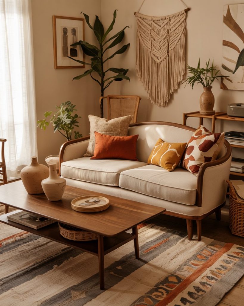 This idea marries mid-century shapes and warm woods with boho’s relaxed layering and global accents. A curved walnut sofa, terrazzo side table, macramé planters, and a shag rug might populate the room. I recall a client who cherished vintage Danish chairs; incorporating them with rattan elements and global textiles gave a fresh boho spin on modern mid-century style.