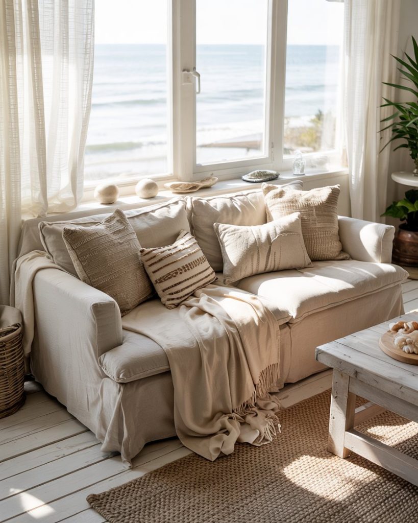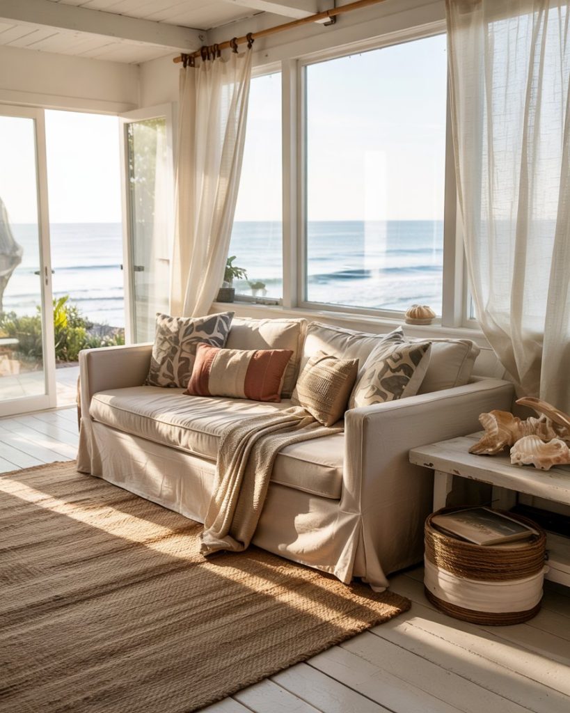 Coastal vibes can be created with soft blues, sandy neutrals, and weathered white wood. For a breezy charm, include seashell ornaments, driftwood, and linen texture. While visiting Cape Cod, I experienced a living room with woven baskets and airy drapes. It was a perennial summer feeling.